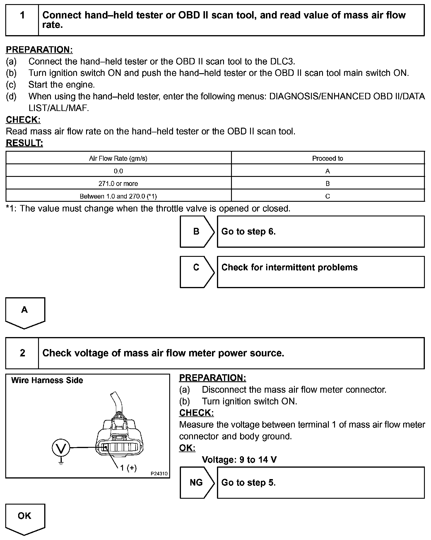 HINT: After confirming DTC P0100, confirm the mass air flow ratio with the hand-held tester or OBD II scan tool. Enter the following menus: DIAGNOSIS / ENHANCED OBD II / DATA LIST / ALL.