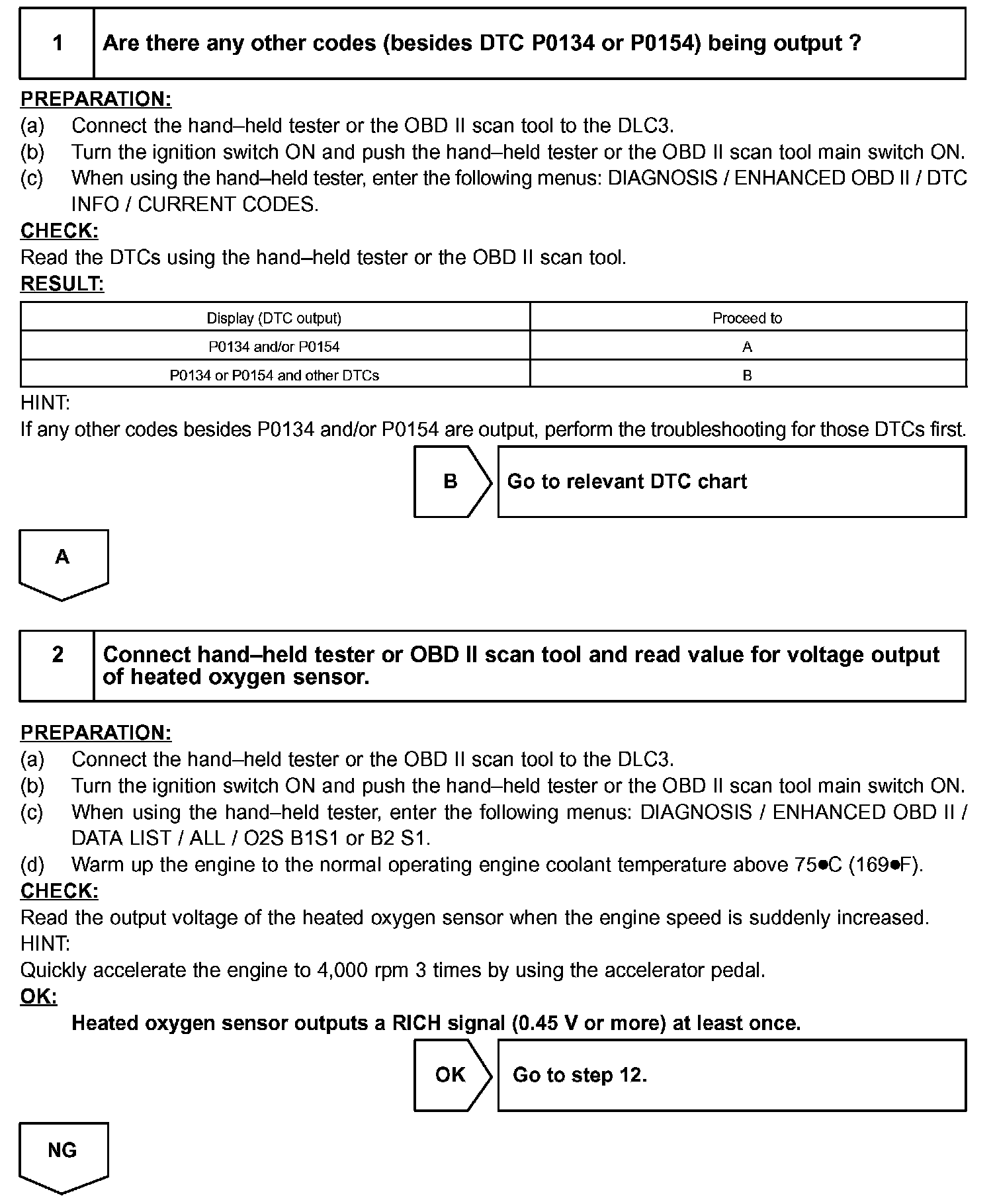 HINT: After confirming DTC P0134 and P0154, confirm the output voltage of the heated oxygen sensor with the hand-held tester or the OBD II scan tool. Enter the following menus: DIAGNOSIS / ENHANCED OBD II / DATA LIST / ALL.