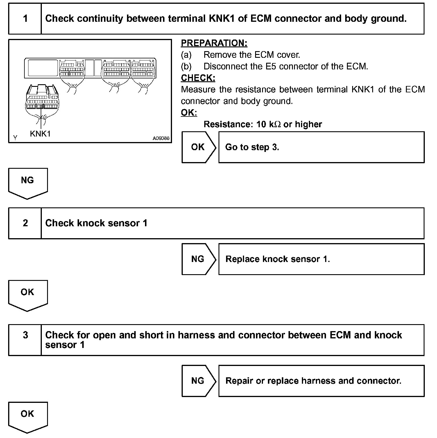 - With the engine racing (4,000 rpm), measure between terminal KNK of the ECM connector and body ground.