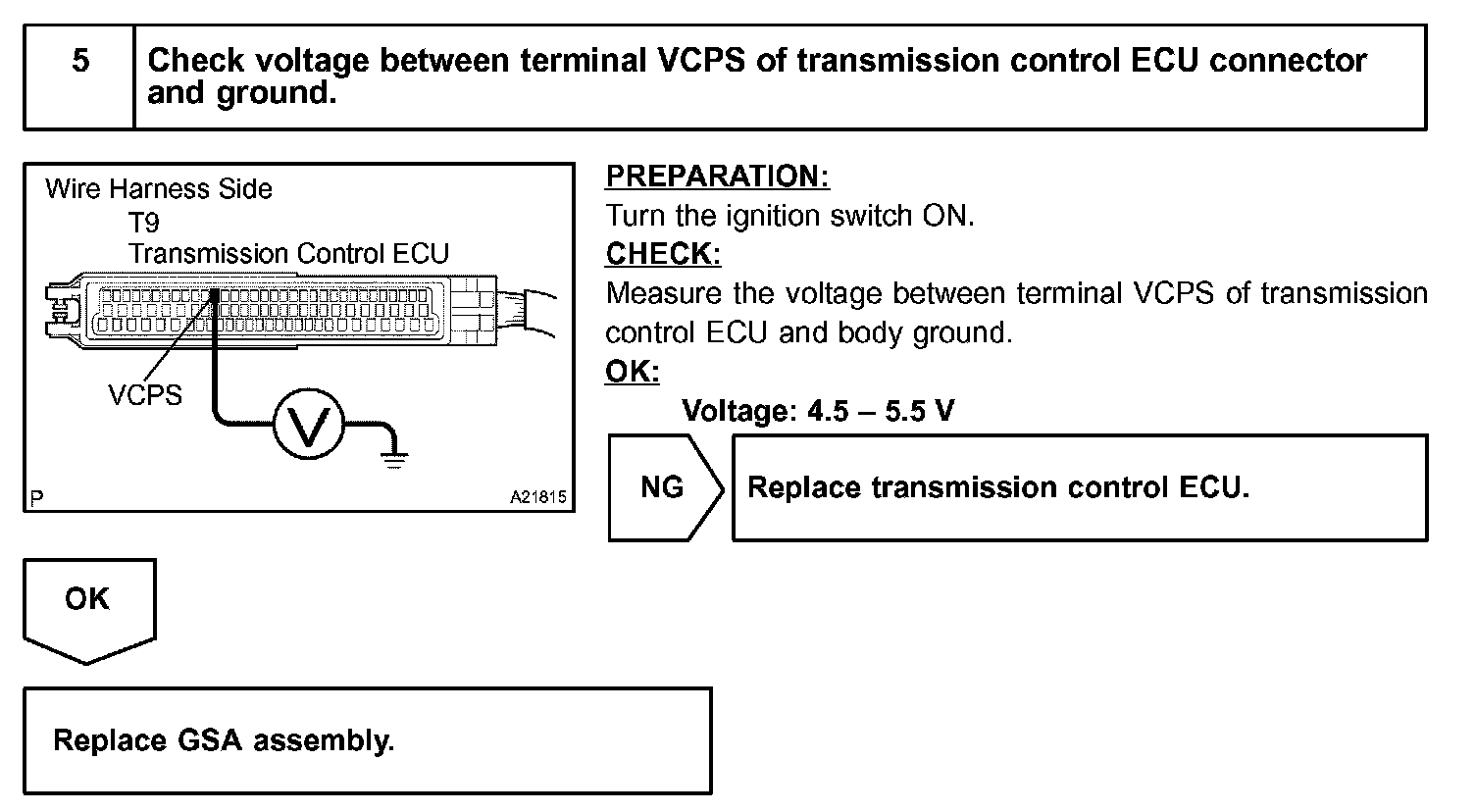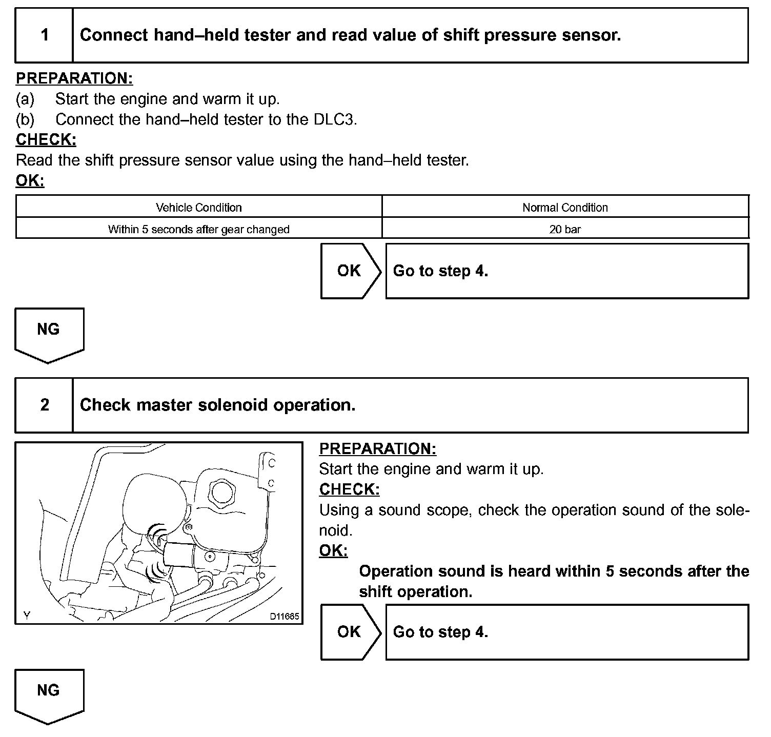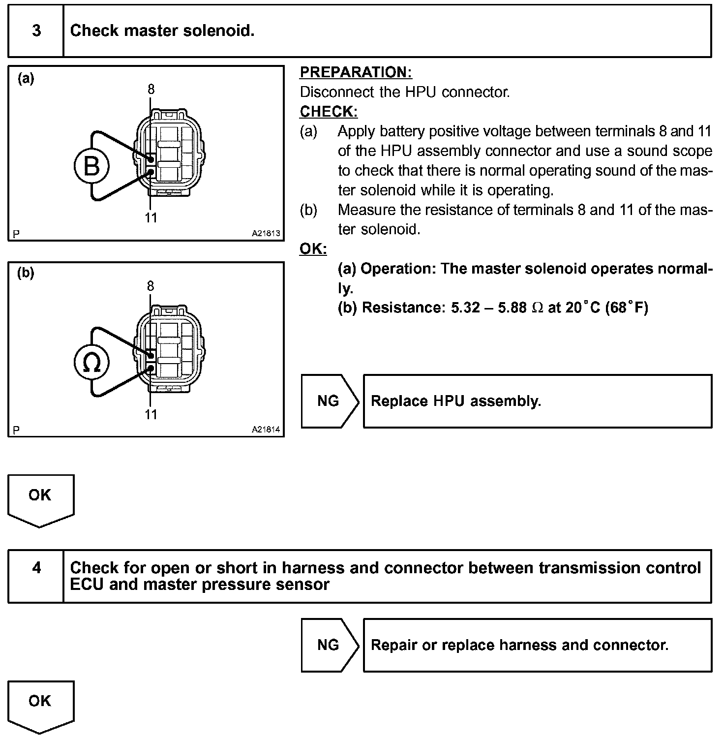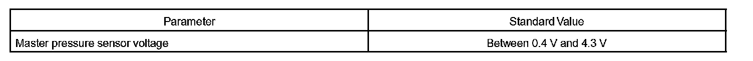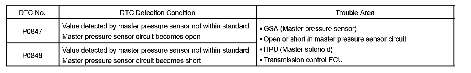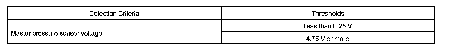 If the output voltage of the master pressure sensor is 4.75 V or more, or if the output voltage is less than 0.25 V, the transmission ECU will conclude that there is a malfunction of the pressure sensor or circuit, illuminate the MIL and set a DTC.