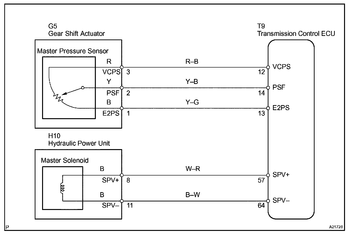 The master pressure sensor, installed in the Gear Shift Actuator (GSA), monitors hydraulic pressures of the Sequential Manual Transmission (SMT) fluid. This pressure is monitored as it comes from the Hydraulic Power Unit (HPU). This sensor's resistance varies depending on the amount of with the hydraulic pressure. The ECM applies a 5 V "pull-up" voltage to the sensor terminal and calculates the hydraulic pressure based on how much the sensor can "pull-down" this voltage. If the hydraulic pressure is high and the sensor resistance is high, the voltage will stay high. When the sensor resistance is low, the sensor will "pull-down" the voltage to a low level.