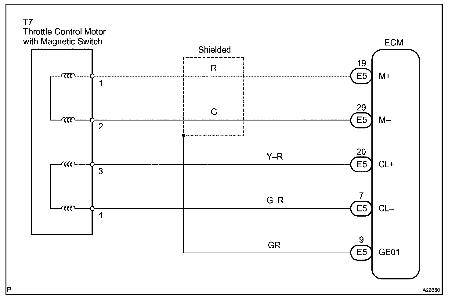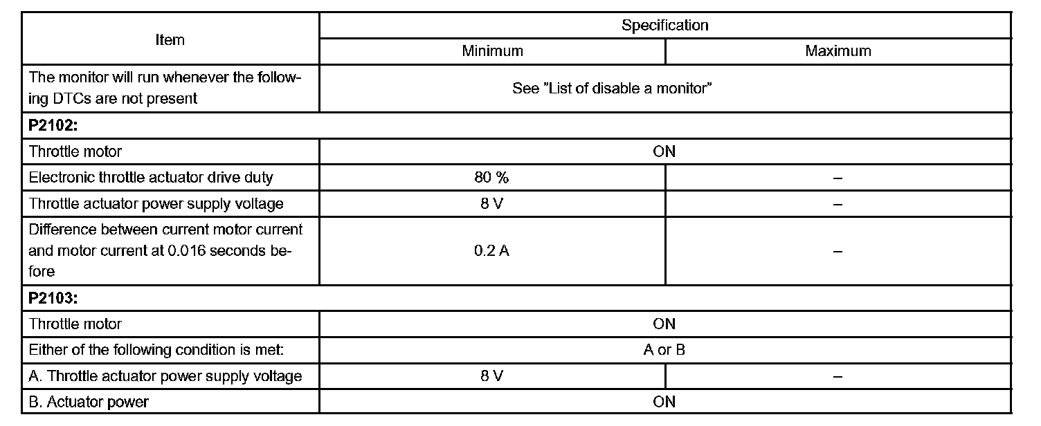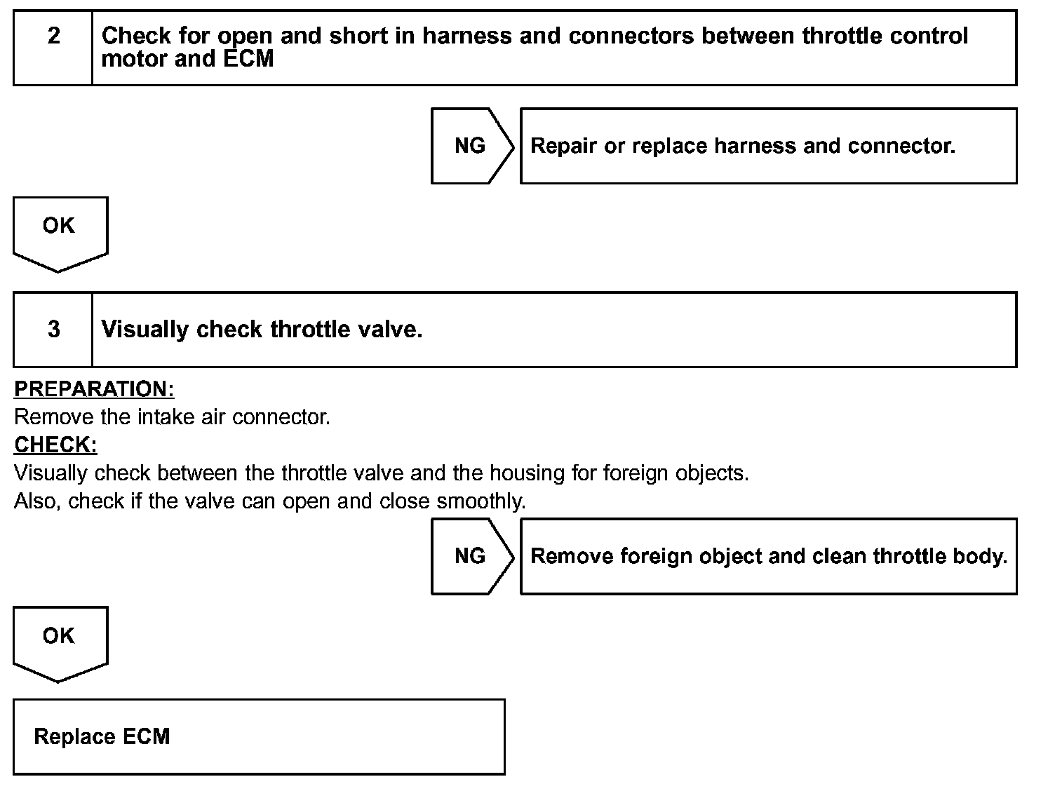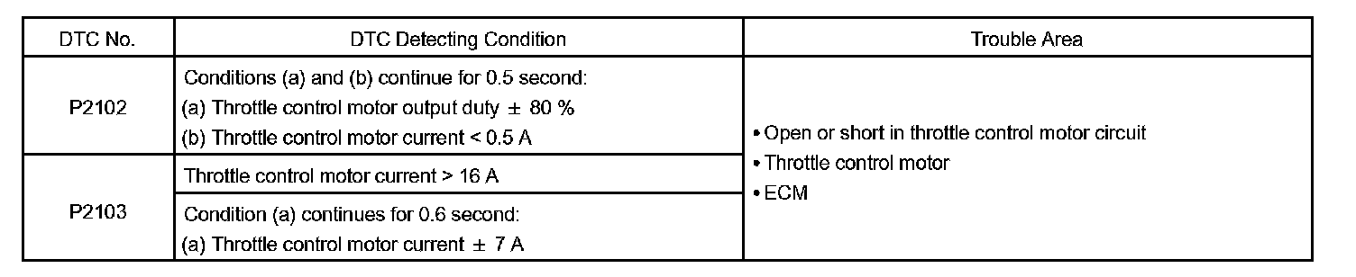 If this DTC is stored, the ECM shuts down the power for the throttle motor and the magnetic clutch, and the throttle valve is fully closed by the return spring.