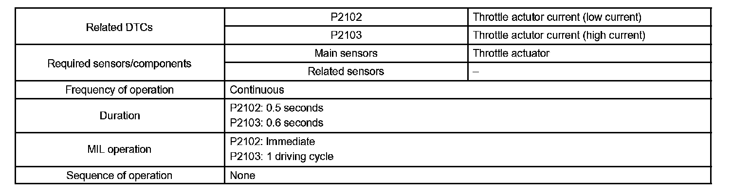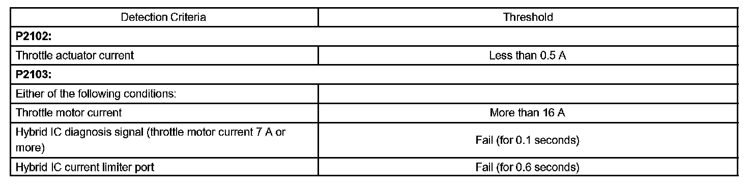 The ECM monitors the current flowing through the throttle motor and detects malfunctions and/or an open circuit in the throttle motor based on these measurements. When the current deviates from the normal range, the ECM interprets this as a malfunction in the throttle motor and sets a DTC.