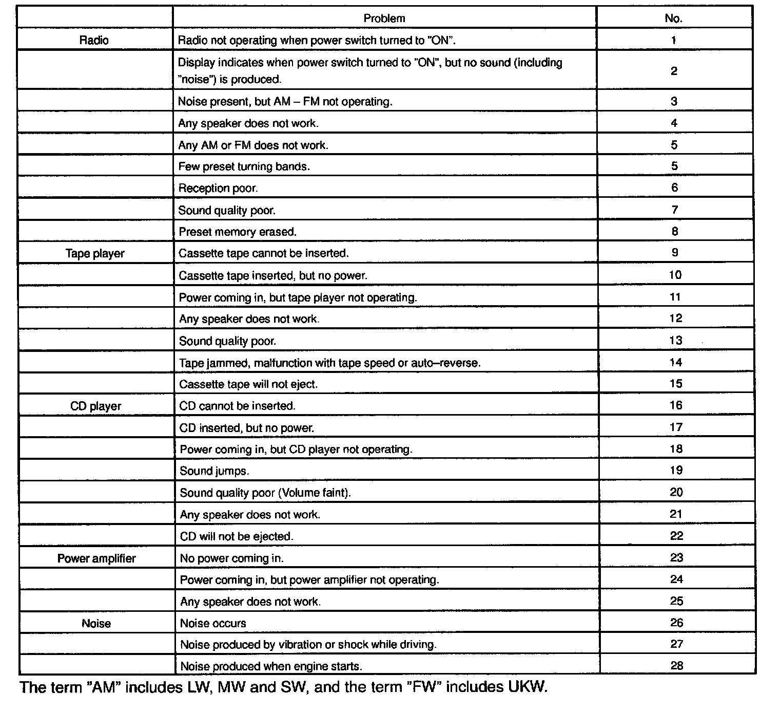 TROUBLESHOOTINGNOTE: When replacing the internal mechanism (computer part) of the audio system, be careful that no part of your body or clothing comes in contact with the terminals of the leads from the IC, etc. of the replacement part (spare part).