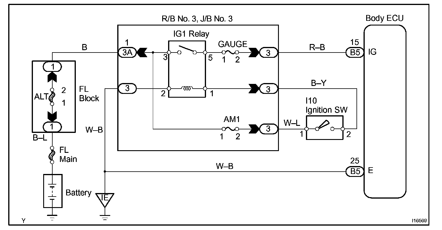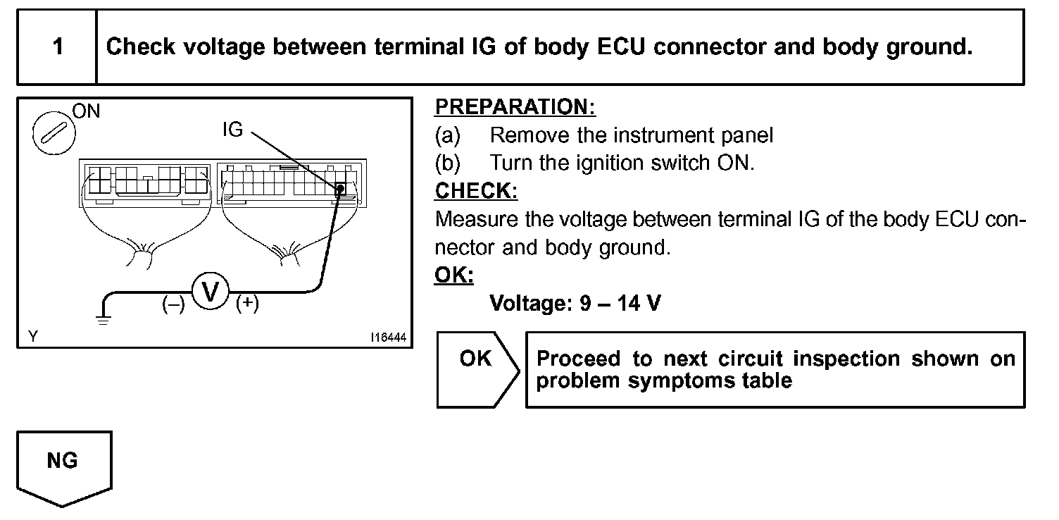 When the ignition switch is turned to the ON position, battery positive voltage is applied to terminal IG of the body ECU.