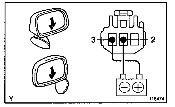 c. Connect the positive (+) lead from the battery to terminal 2 and the negative (-) lead to terminal 3, and check that the mirror turns downward.