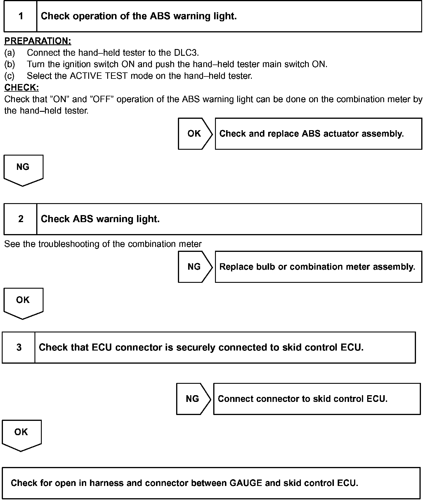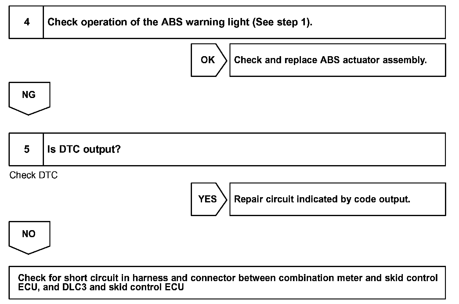 Connecting terminals Tc and CG of the DLC3 to makes the ABS warning light blink and outputs the DTC.