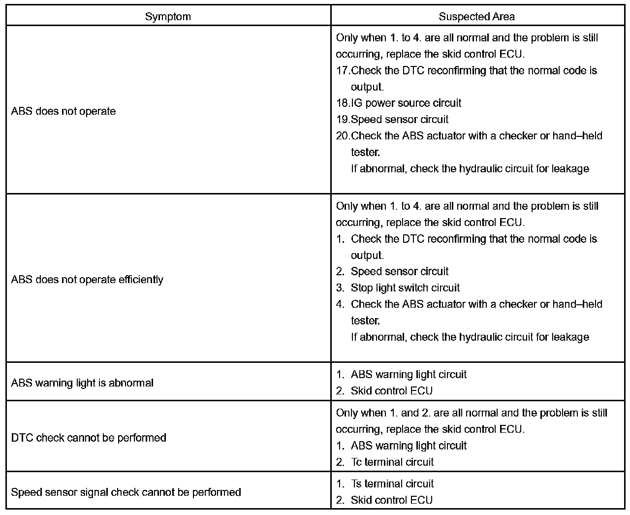If a normal code is displayed during the DTC check but the problem still occurs, check the circuits for each problem symptom in the order given in the table and proceed to the relevant troubleshooting.