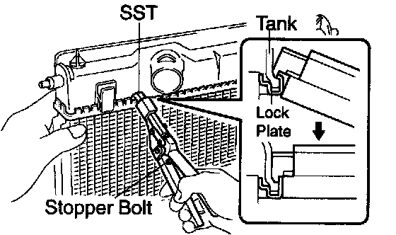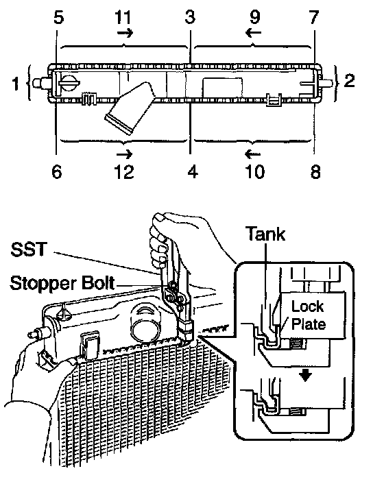 a. Lightly press SST against the lock plate in the order shown in the illustration. After repeating this a few times, fully caulk the lock plate by squeezing the handle until stopped by the stopped plate.