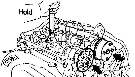 a. Hold the hexagonal head wrench portion of the camshaft with a wrench, and loosen the sprocket.