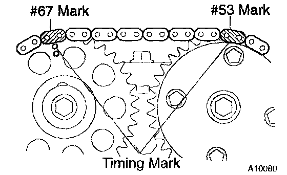 b. Install the timing chain on the camshaft timing sprocket and VVT timing sprocket with the # 53 and # 67 mark links aligned with the timing marks on the camshaft timing sprocket and VVT timing sprocket.