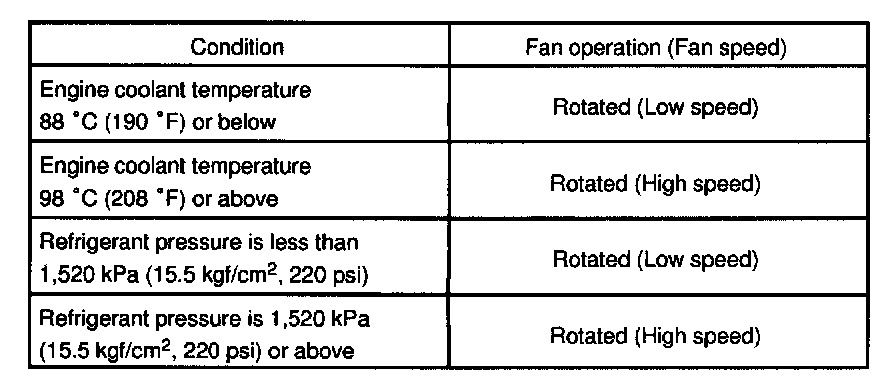 If operation is as specified, check the pressure switch, cooling fan relays and engine coolant temperature switch.