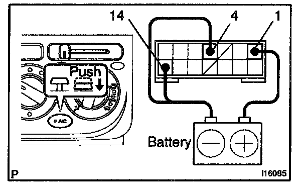 a. Connect the positive (+) lead from the battery to terminal 1 and the negative (-) lead to terminals 4 and 14 while pressing the switch.