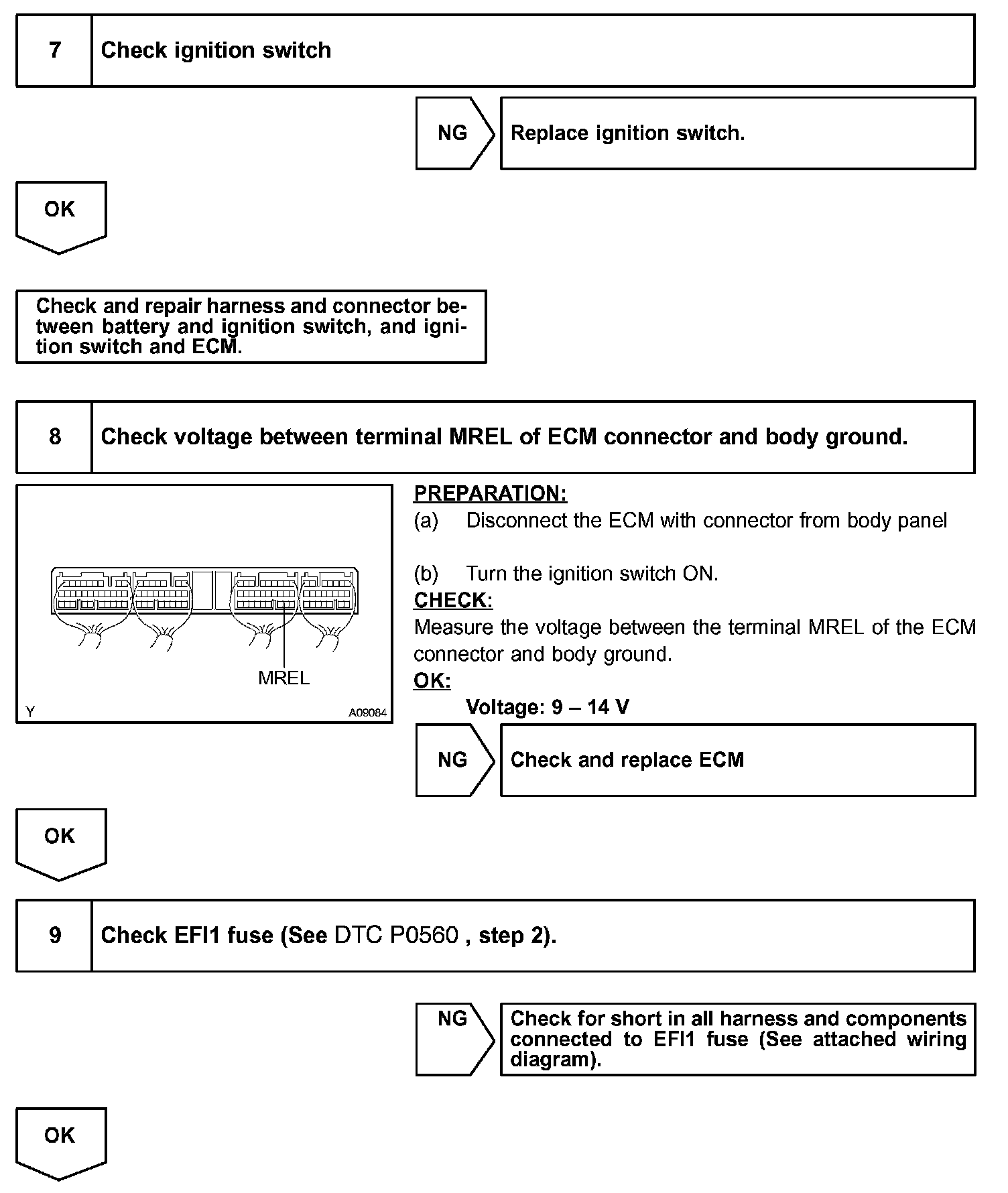 This signal causes current to flow to the coil, closing the contacts of the EFI main relay and supplying power to terminals +B of the ECM.