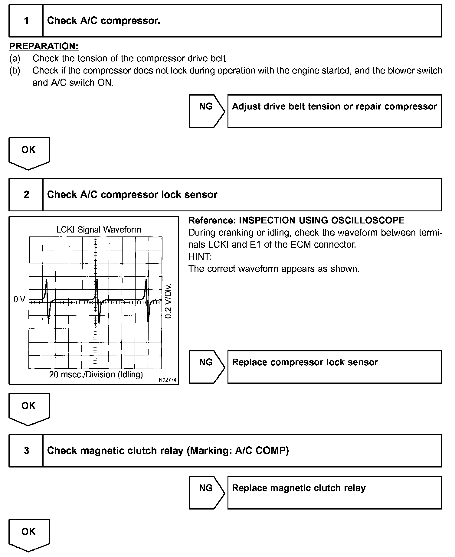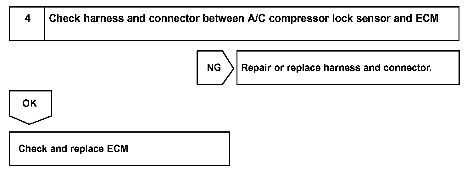 This sensor sends 1 pulse per engine revolution to the ECM. If the number ratio of the compressor speed divided by the engine speed is smaller than a predetermined value, the ECM turns the compressor off. And, the indicator flashes at about 1 second interval.