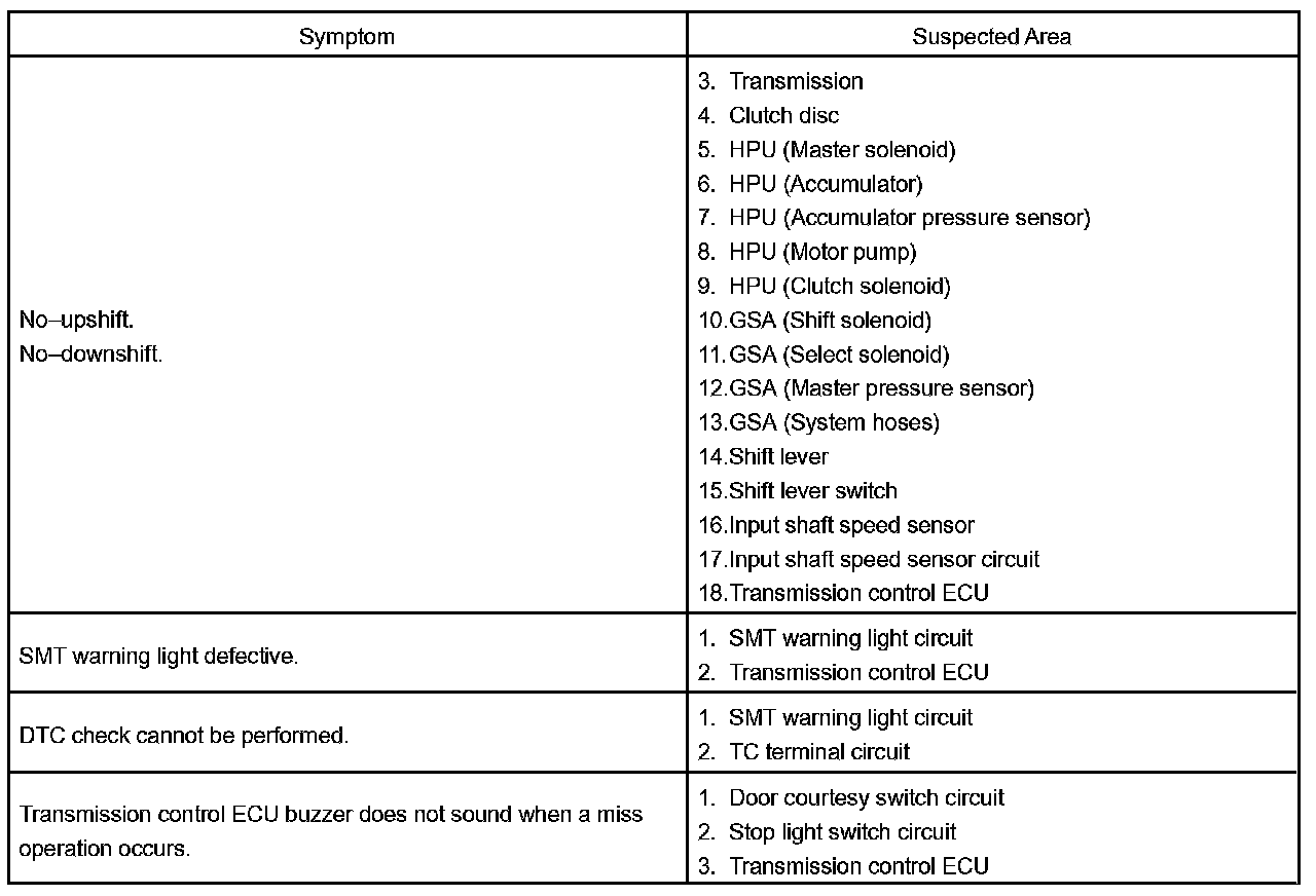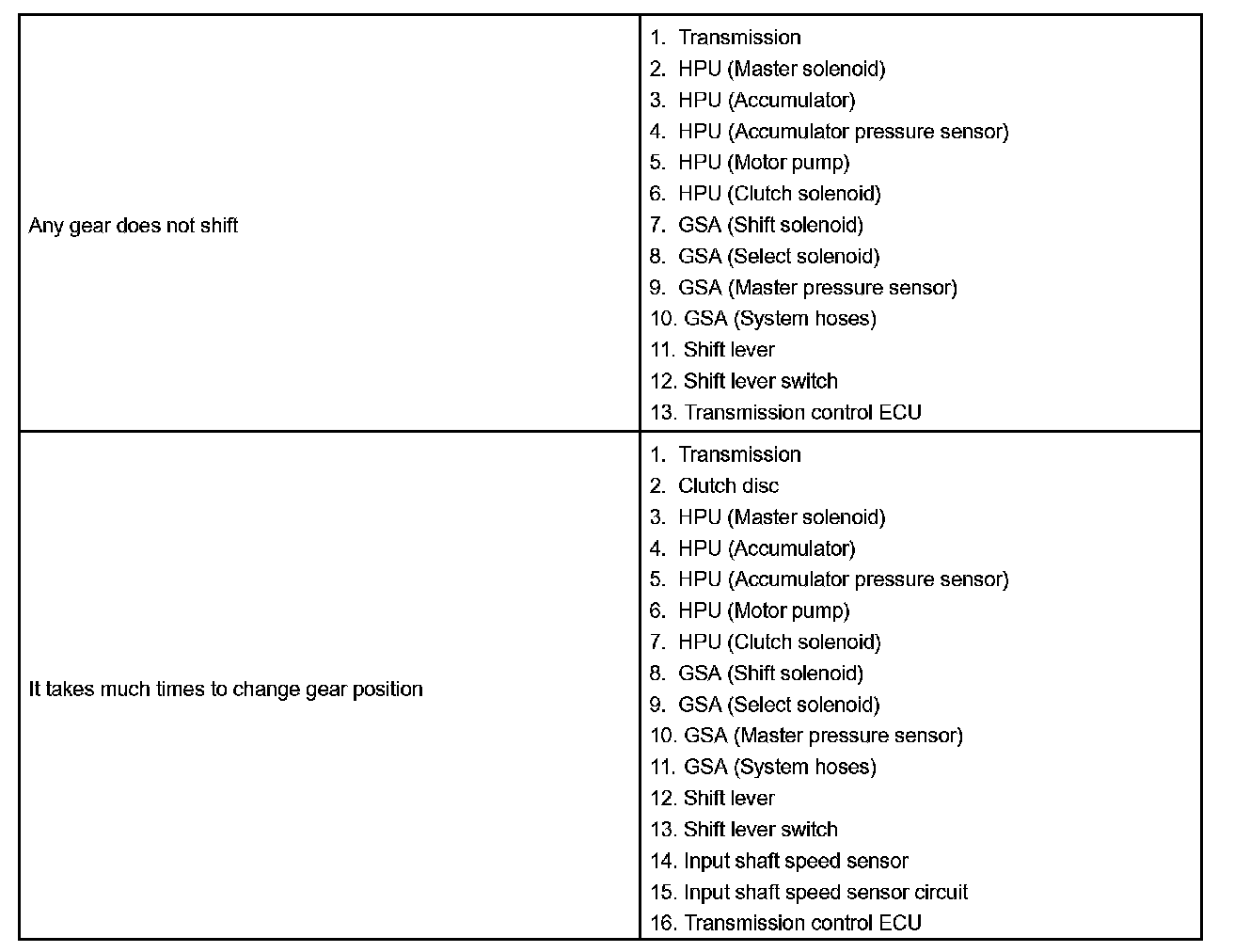 NOTE: Before replacing the transmission control ECU or sensor, turn the ignition switch OFF and close the driver's door after replacing the transmission control ECU, perform "Initial Learning of Transmission Control ECU".