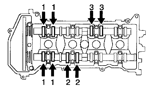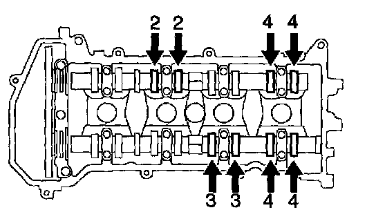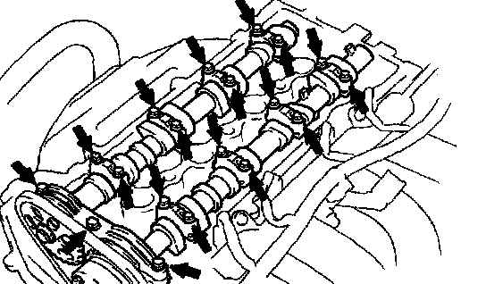 1) Remove the 19 bolts and 9 camshaft bearing caps.