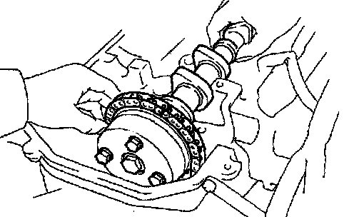 j. Hold the timing chain, and place the intake camshaft and timing sprocket assembly.