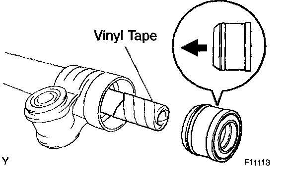 b. To prevent oil seal lip damage, wind vinyl tape on the steering rack end, and apply power steering fluid.