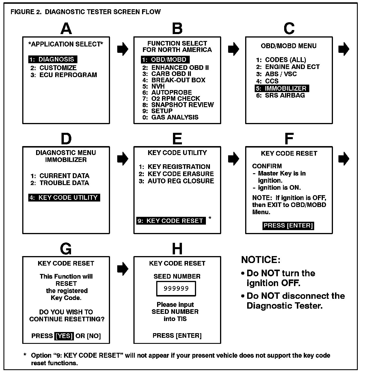 1. Using the Diagnostic Tester, follow the screen flow in Figure 2 shown to retrieve the "Seed Number." (DO NOT DISCONNECT the Diagnostic Tester from the vehicle during this process.)