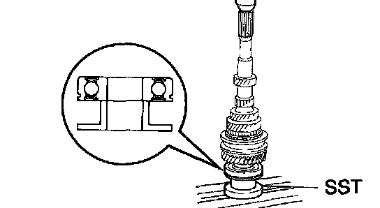 a. Using SST and a press, press out the rear radial ball bearing and 4th gear.