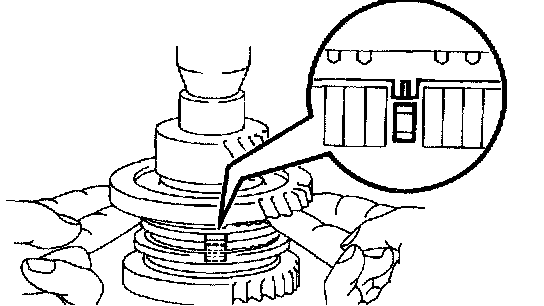 e. Place the reverse gear and No. 1 cluck hub assembly and align the No. 1 synchronizer ring slots with the No. 1 shifting keys.