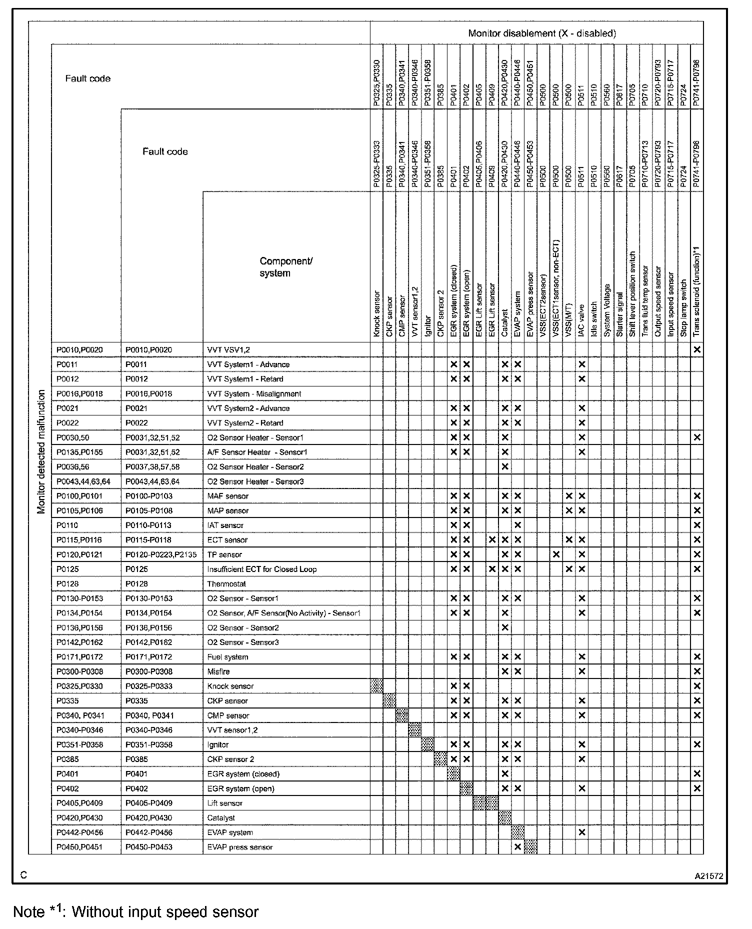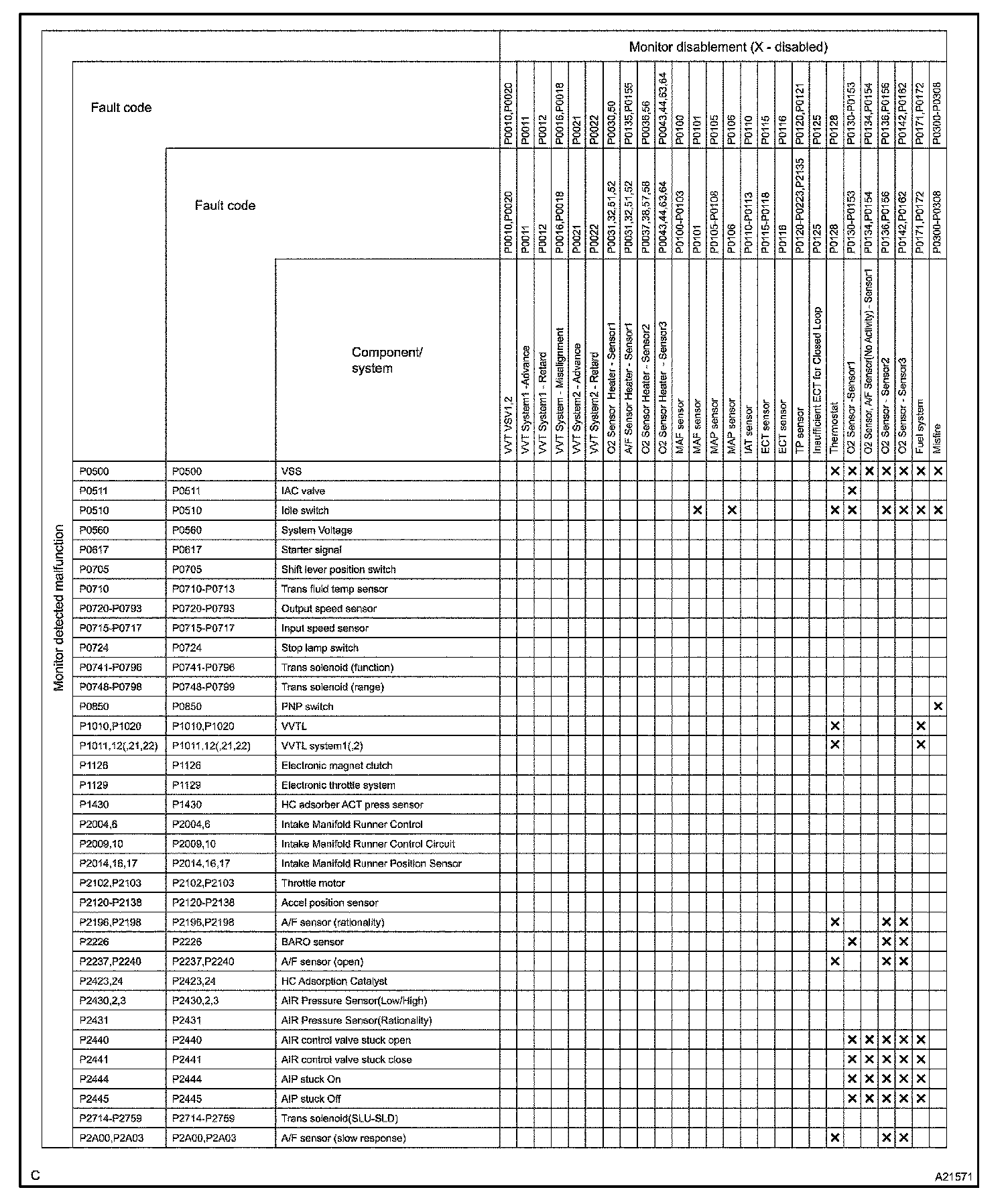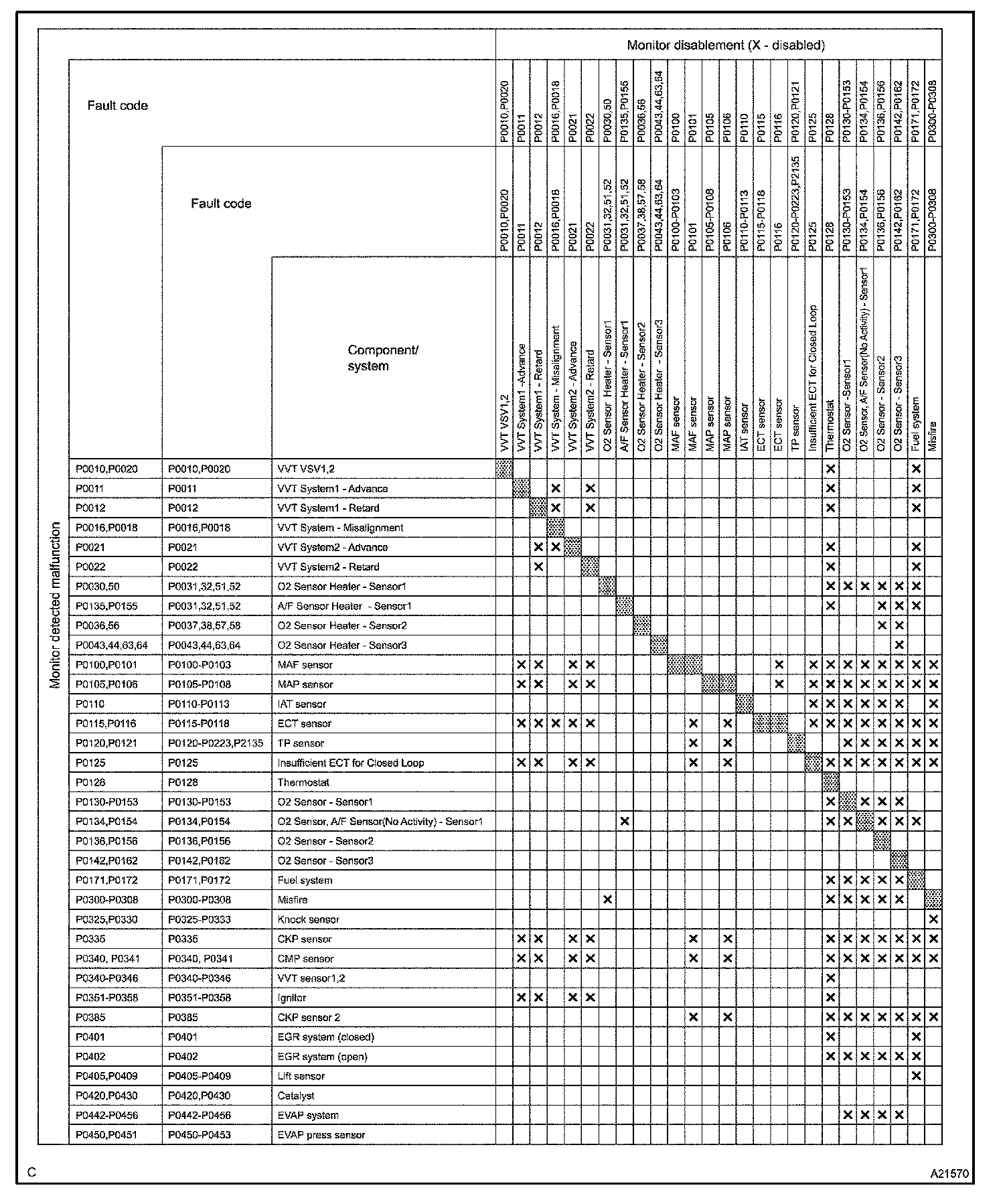 THE MONITOR WILL RUN WHENEVER THE FOLLOWING DTCS ARE NOT PRESENT (MONITOR DISABLEMENT LIST)HINT: The table indicates ECM monitoring status for the items in the upper columns if the DTCs in each line on the left are being set.