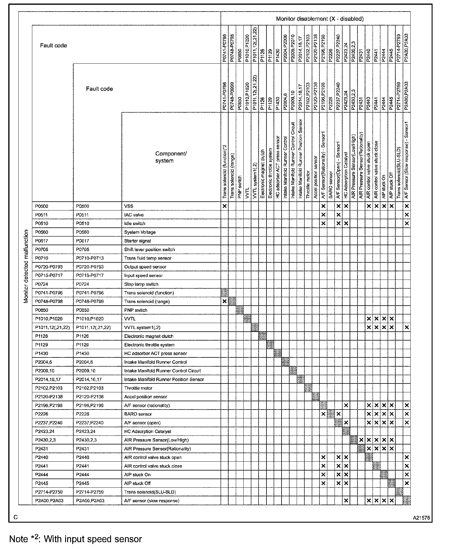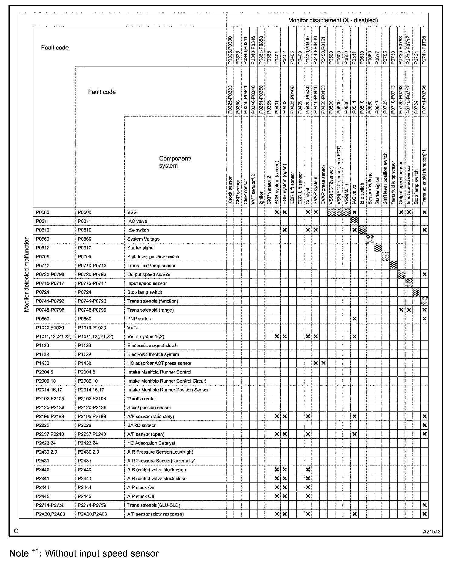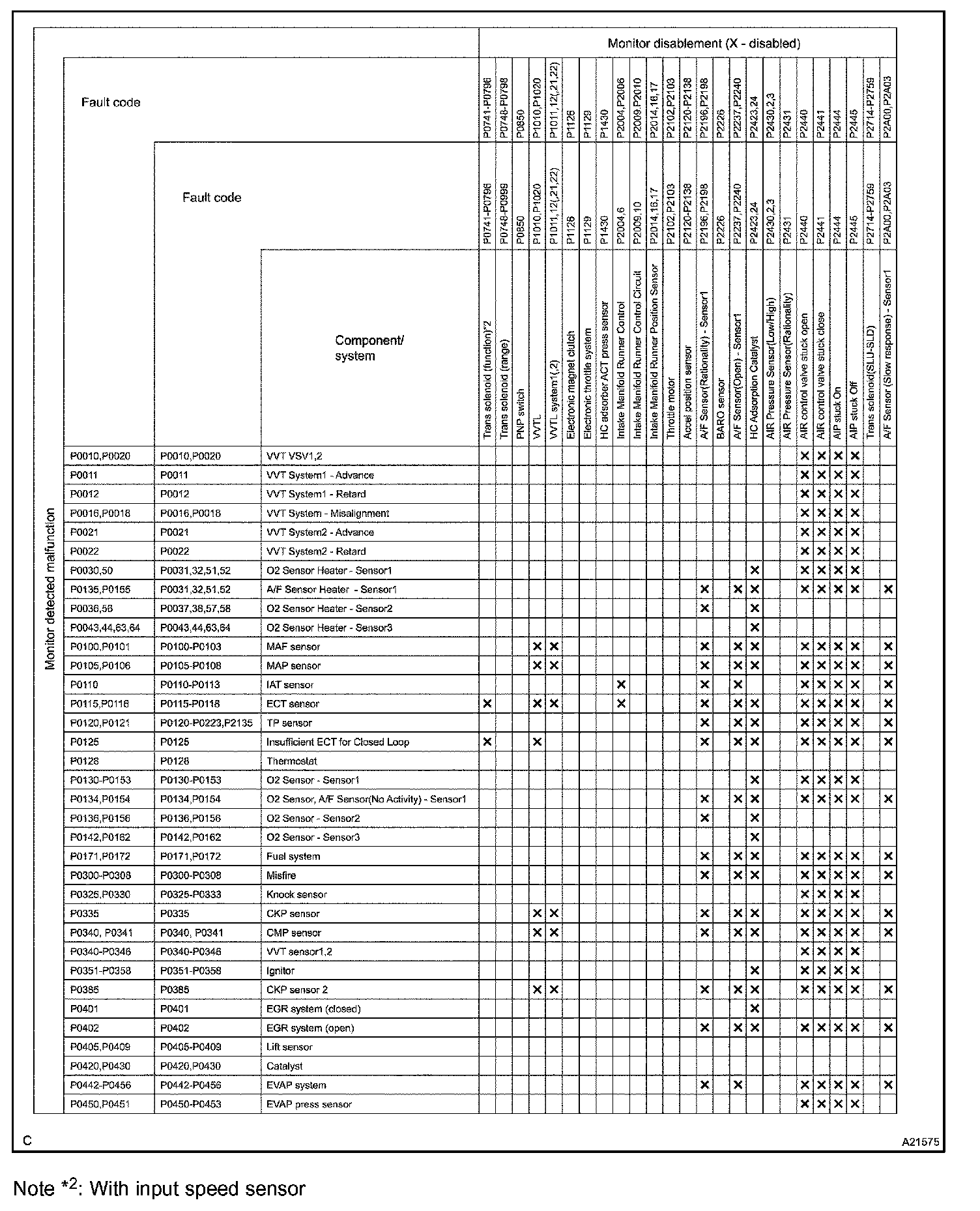 THE MONITOR WILL RUN WHENEVER THE FOLLOWING DTCS ARE NOT PRESENT (MONITOR DISABLEMENT LIST)HINT: The table indicates ECM monitoring status for the items in the upper columns if the DTCs in each line on the left are being set.