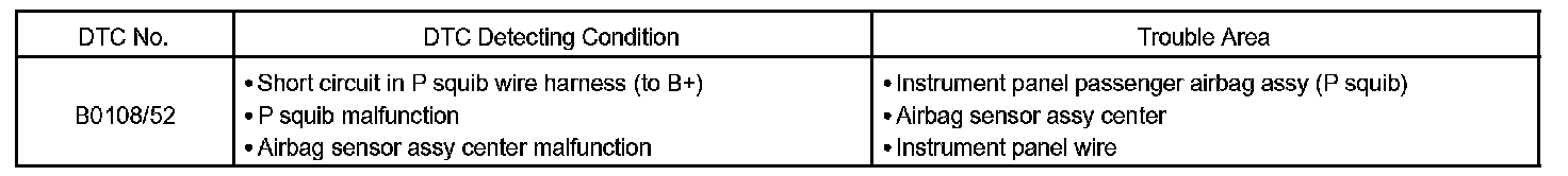 DTC B0108/52 is recorded when a B+ short is detected in the P squib circuit.