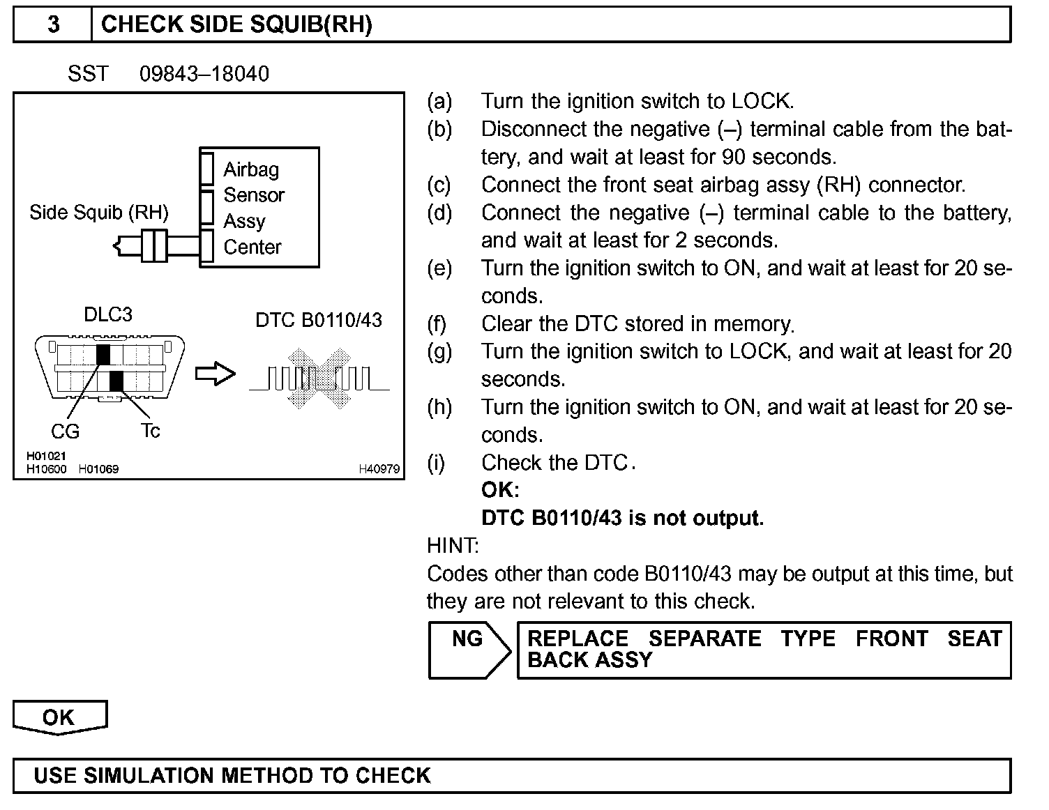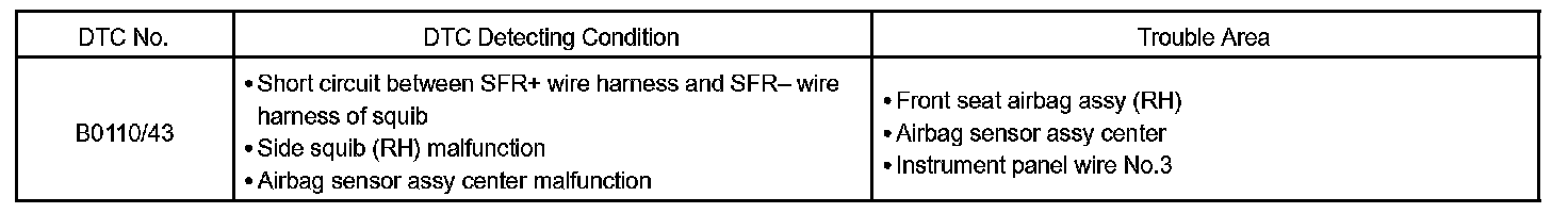 DTC B0110/43 is recorded when a short is detected in the side squib (RH) circuit.