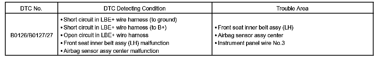 DTC B0126/B0127/27 is recorded when a malfunction is detected in the seat belt buckle switch (LH) circuit.