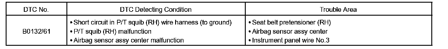 DTC B0132/61 is recorded when a ground short is detected in the P/T squib (RH) circuit.