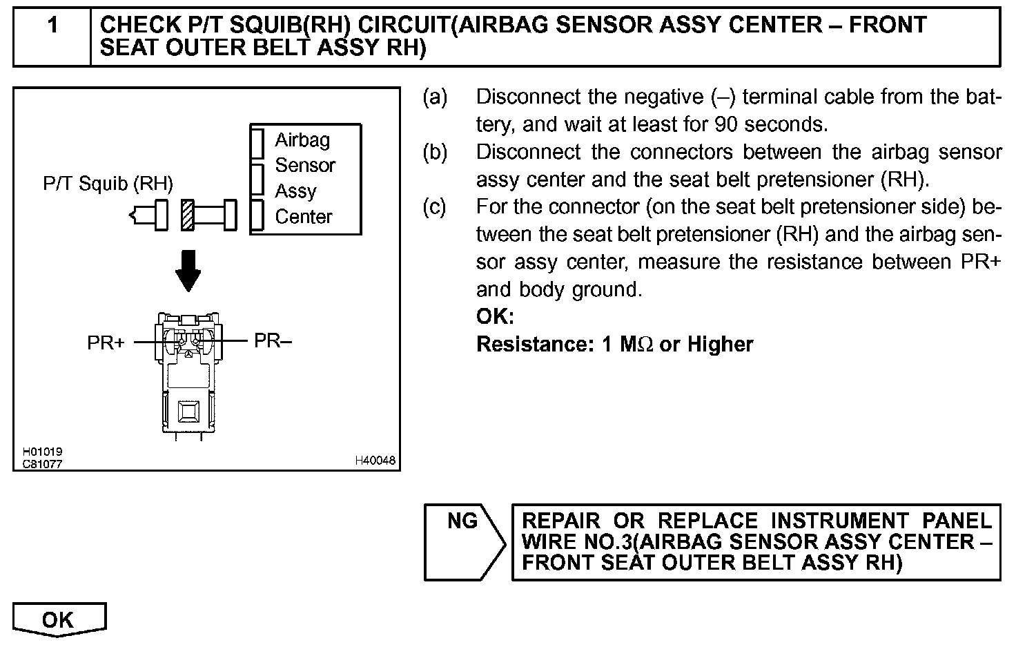 The P/T squib (RH) circuit consists of the airbag sensor assy center and seat belt pretensioner (RH).
