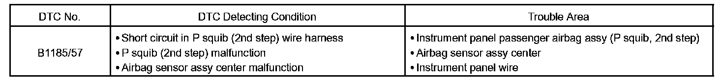 DTC B1185/57 is recorded when a short is detected in the P squib (2nd step) circuit.
