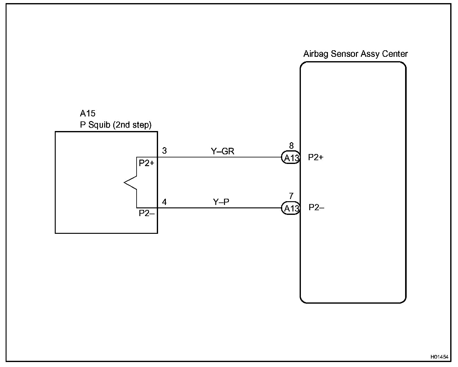 The P squib (2nd step) circuit consists of the airbag sensor assy center and instrument panel passenger airbag assy.