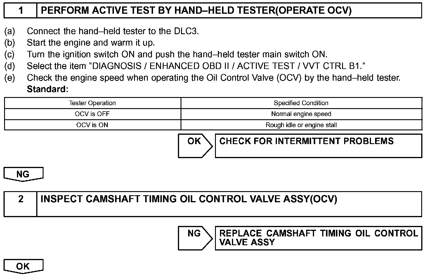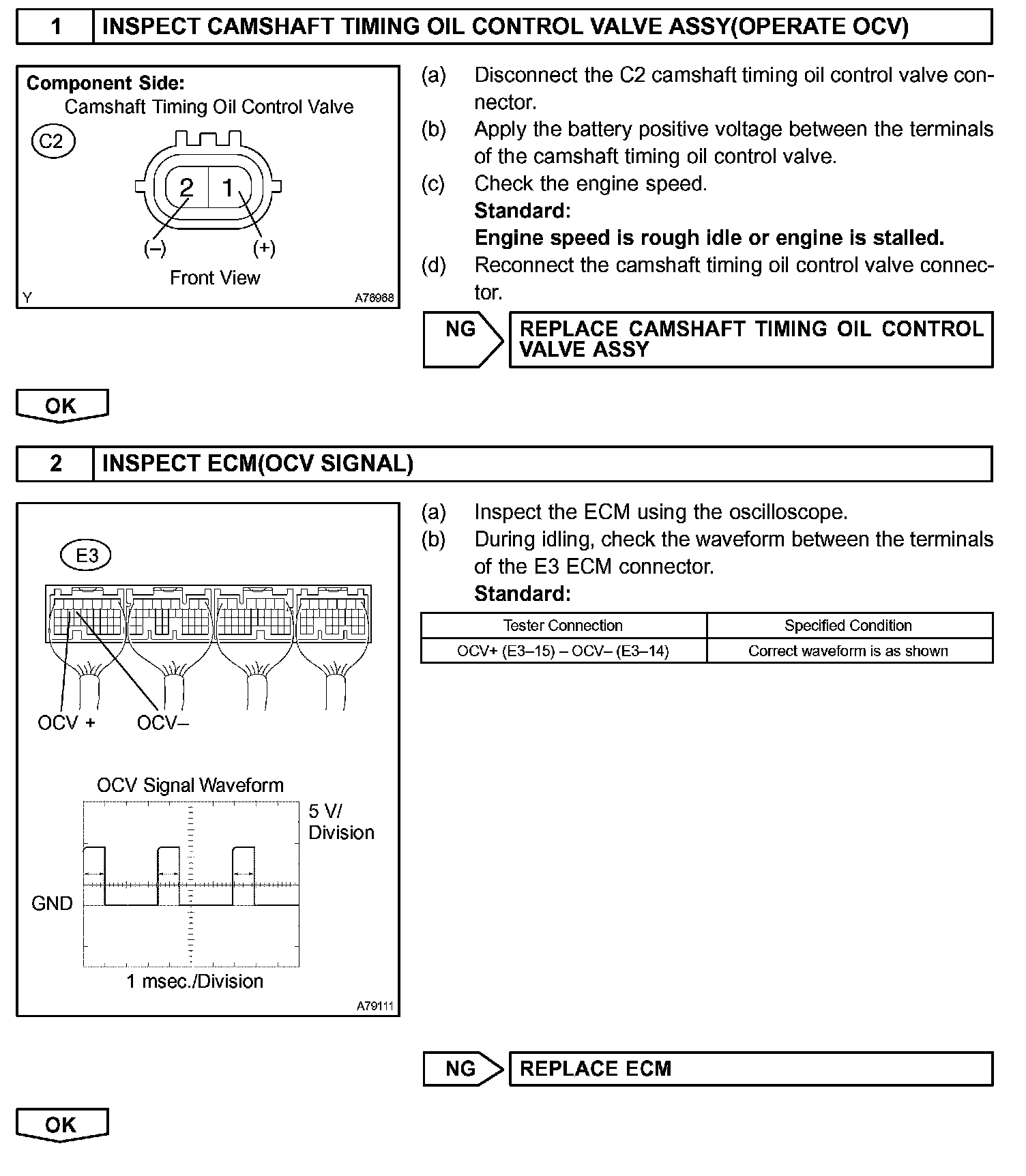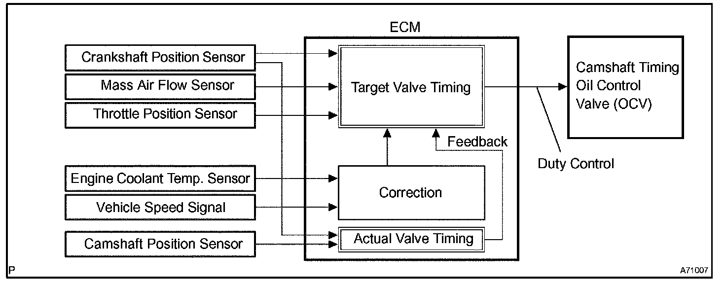 The ECM controls the OCV, based on the signals output from the sensors. The VVT controller regulates the intake camshaft angle using oil pressure through the OCV. As result, the relative position between the camshaft and the crankshaft is optimized, and the engine torque improves, fuel economy improves, and exhaust emissions decrease under overall driving conditions. Also, the ECM detects the actual valve timing using signals from the camshaft position sensor and crankshaft position sensor, and performs the feedback control. This is how target valve timing is verified by the ECM.