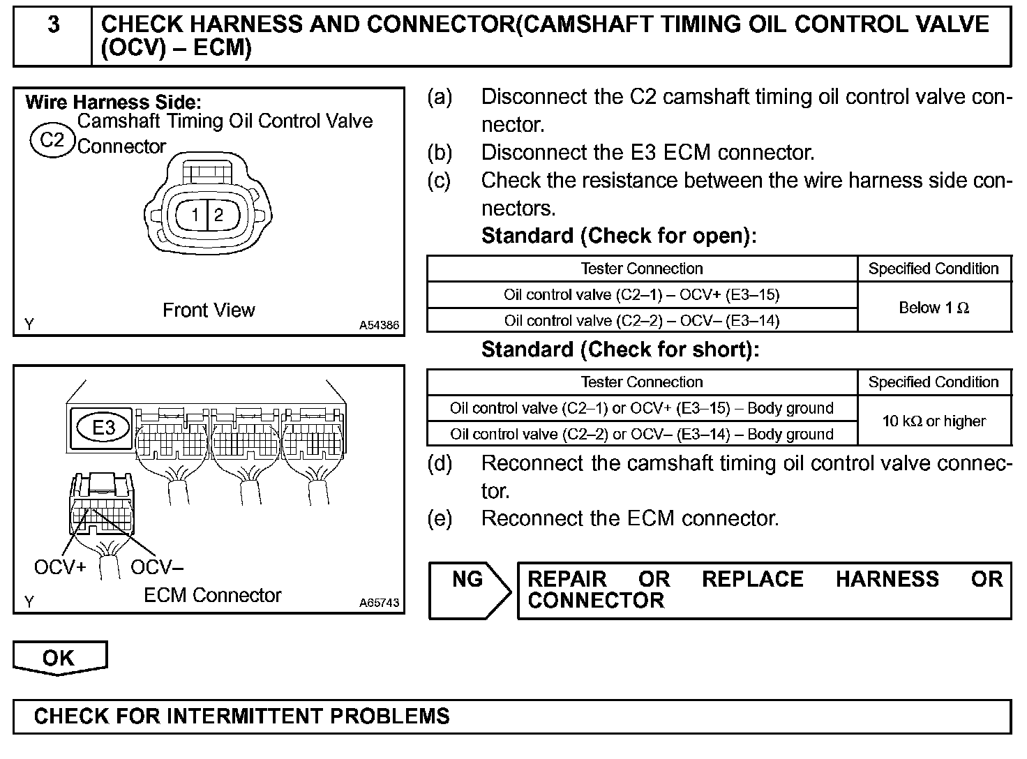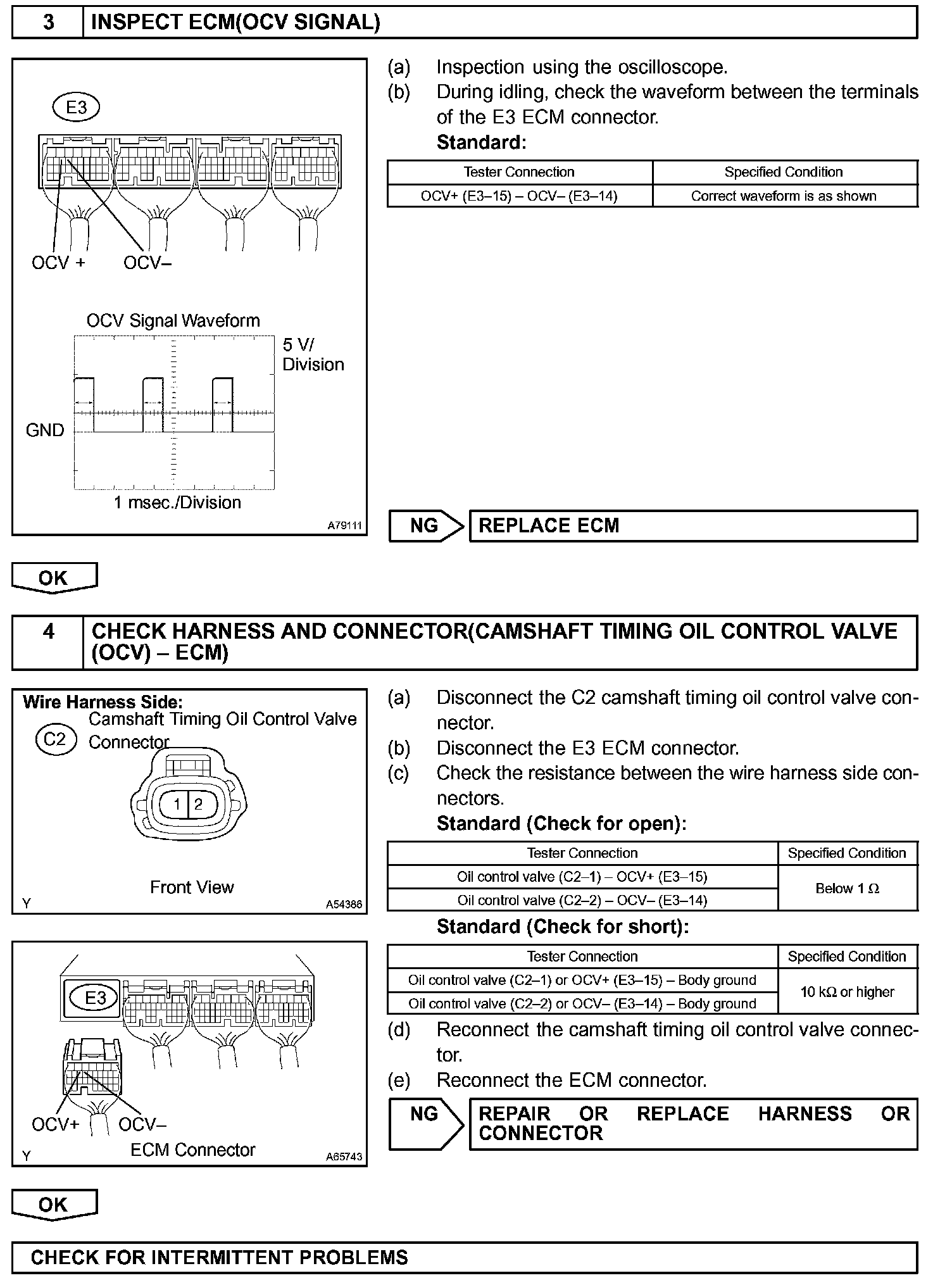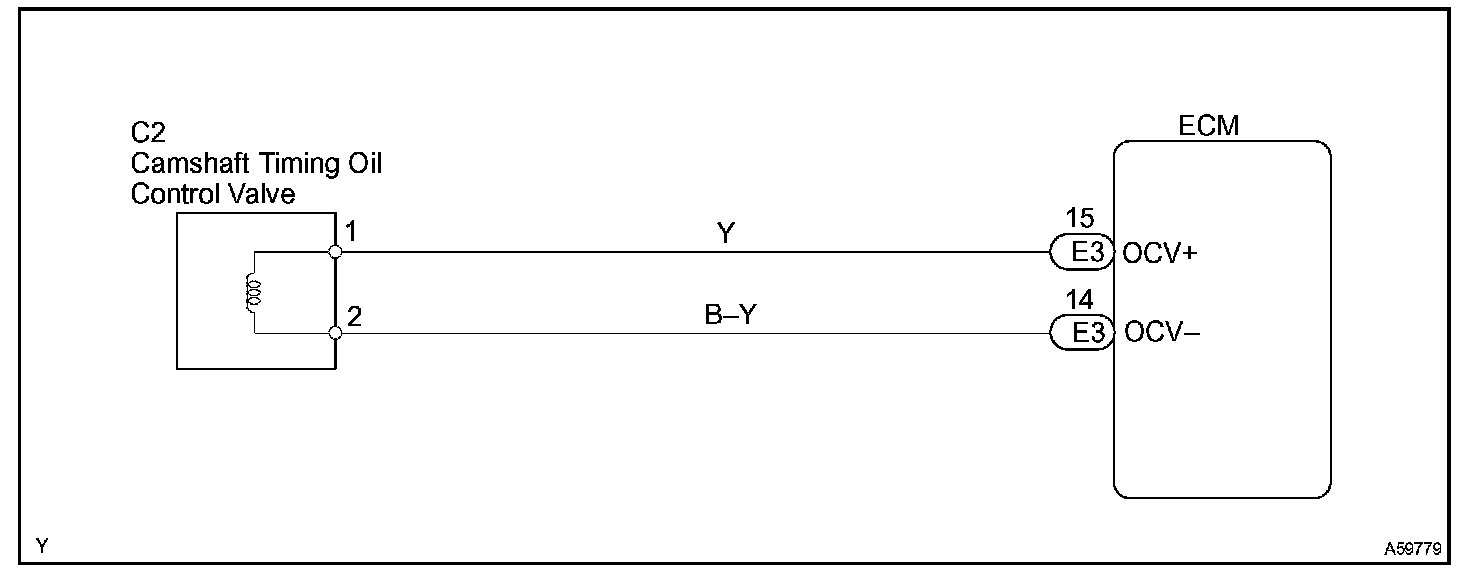The ECM controls the OCV, based on the signals output from the sensors. The VVT controller regulates the intake camshaft angle using oil pressure through the OCV. As result, the relative position between the camshaft and the crankshaft is optimized, and the engine torque improves, fuel economy improves, and exhaust emissions decrease under overall driving conditions. Also, the ECM detects the actual valve timing using signals from the camshaft position sensor and crankshaft position sensor, and performs the feedback control. This is how target valve timing is verified by the ECM.