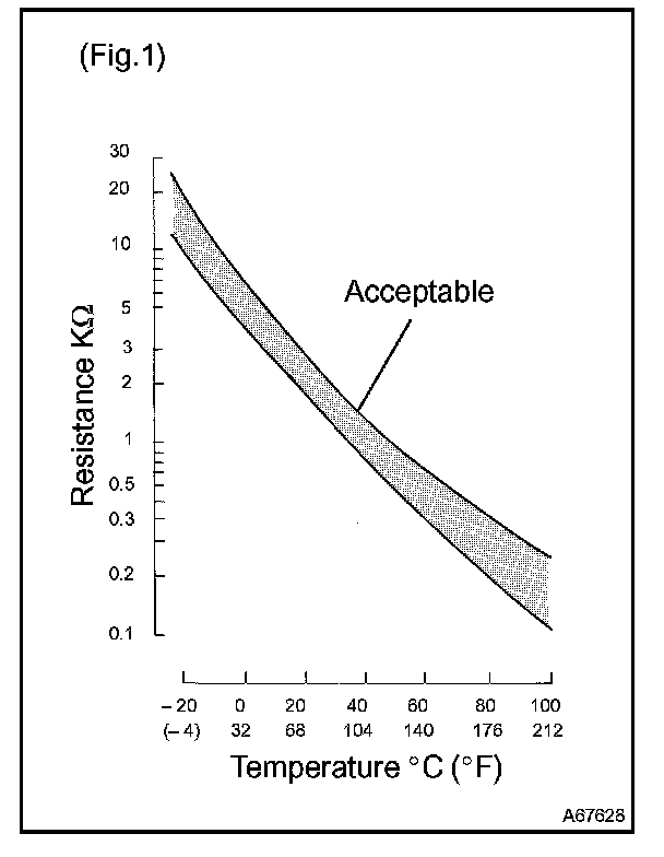 The intake air temperature (IAT) sensor, mounted on the mass air flow (MAF) sensor, monitors the intake air temperature. The IAT sensor has a thermistor that varies its resistance depending on the temperature of the intake air. When the air temperature is low, the resistance in the thermistor increases. When the temperature is high, the resistance drops. The variations in resistance are reflected as voltage changes to the ECM terminal. (See Fig. 1).
