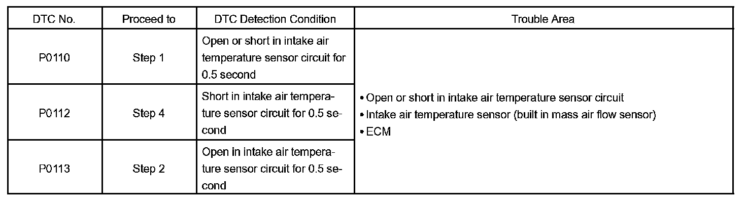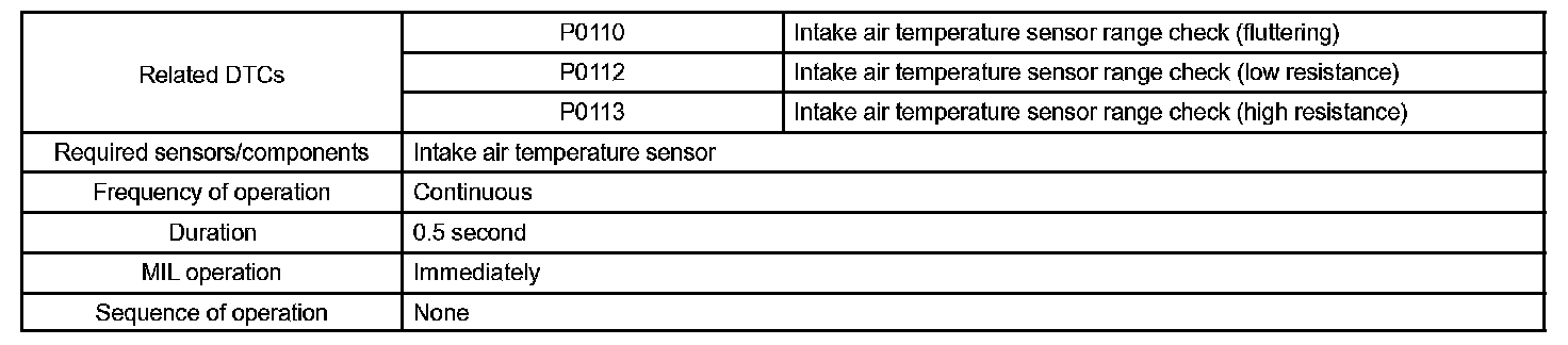 The ECM monitors the sensor voltage and uses this value to calculate the intake air temperature (IAT). When the sensor output voltage deviates from the normal operating range, the ECM interprets this as a fault in the IAT sensor and sets a DTC.