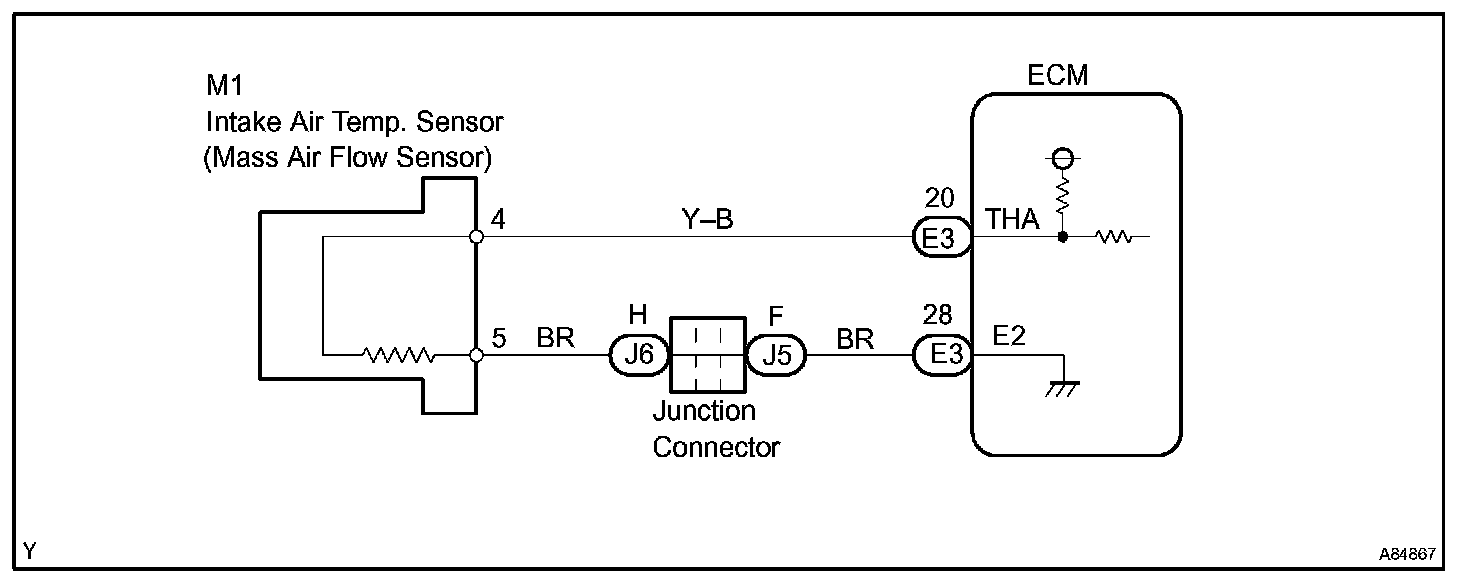 The intake air temperature sensor is connected to the ECM. The 5 V power source voltage in the ECM is applied to the intake air temperature sensor from terminal THA (THAR) via resistor R.