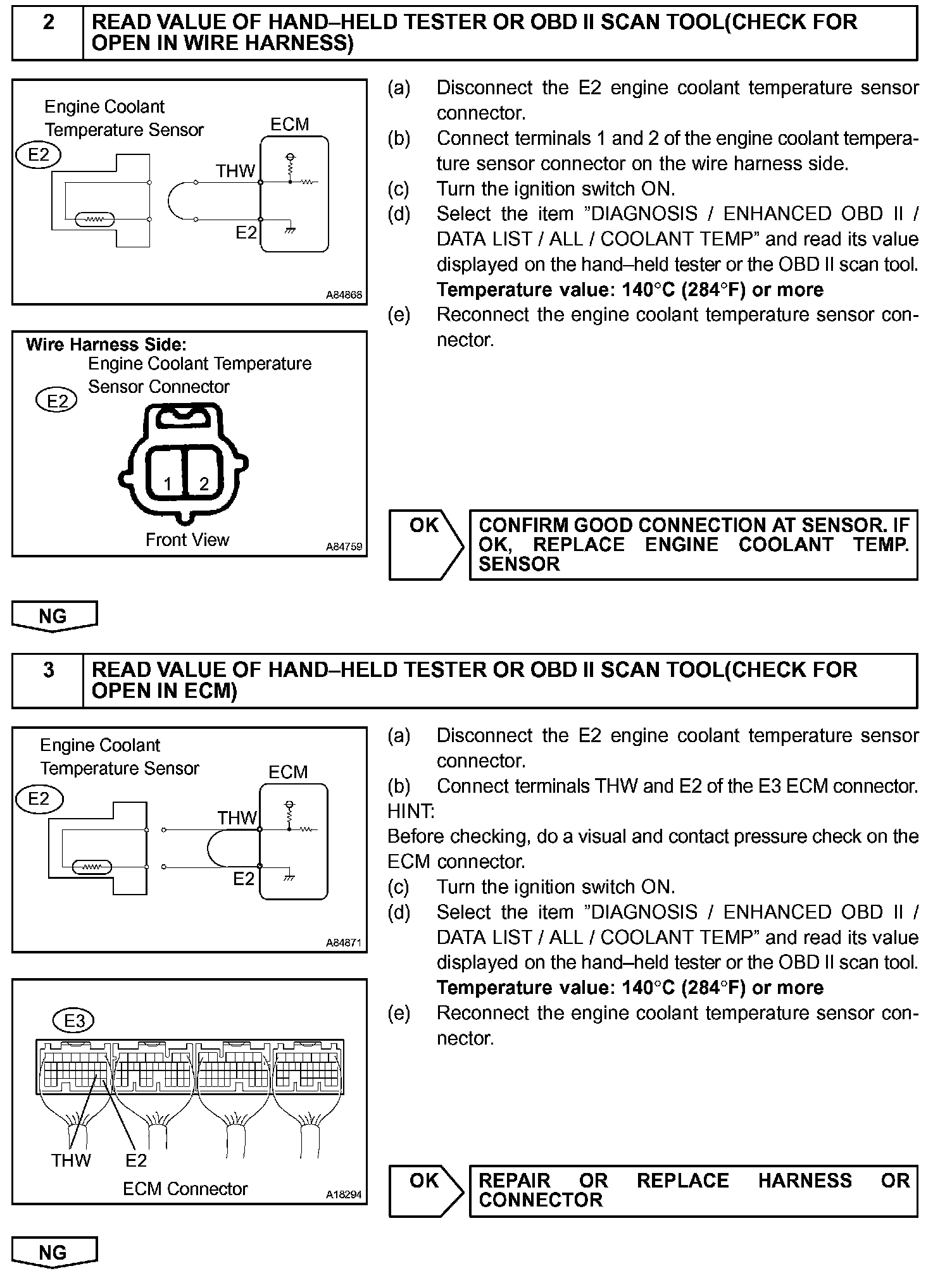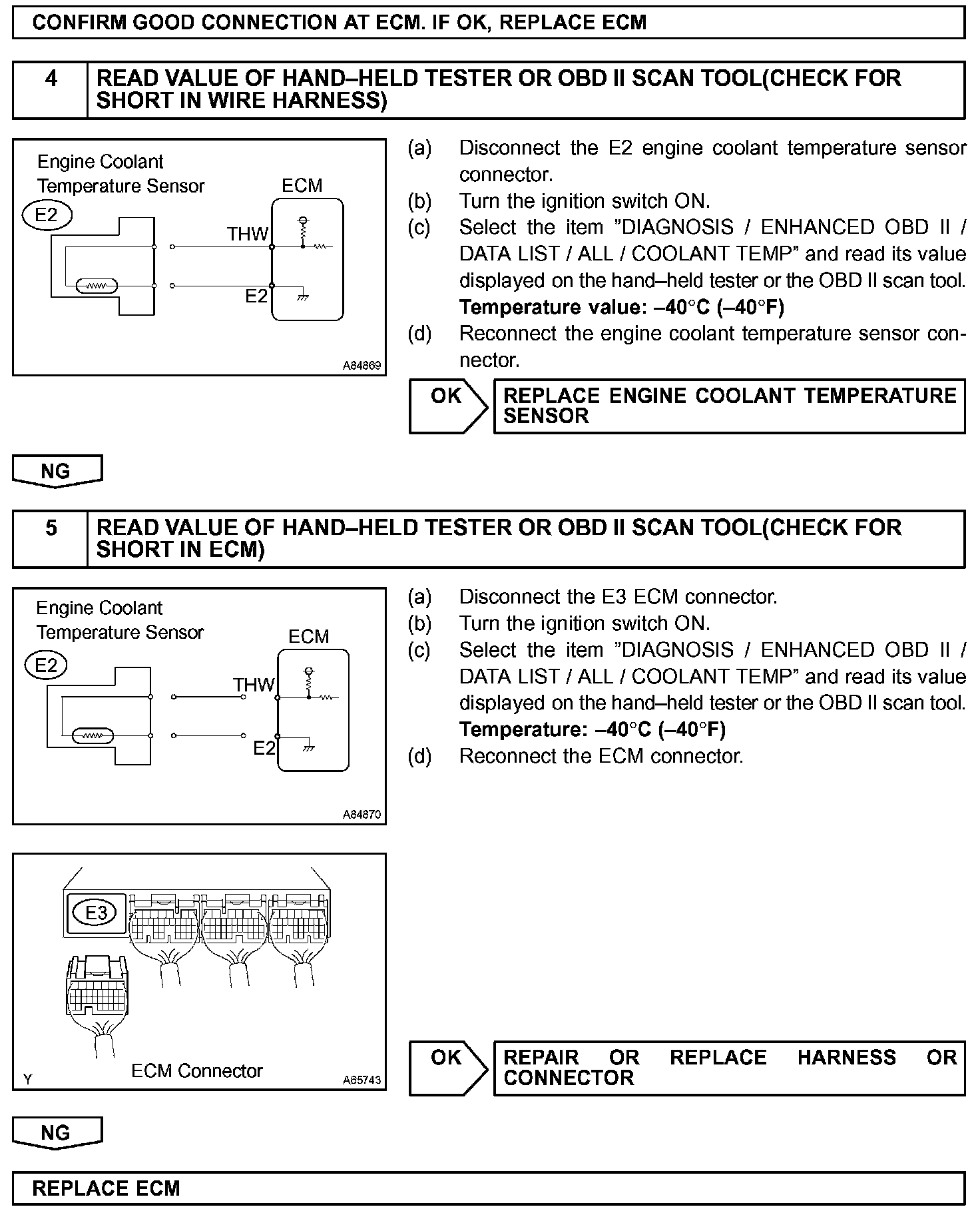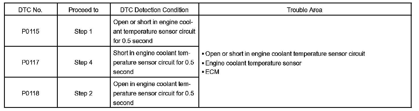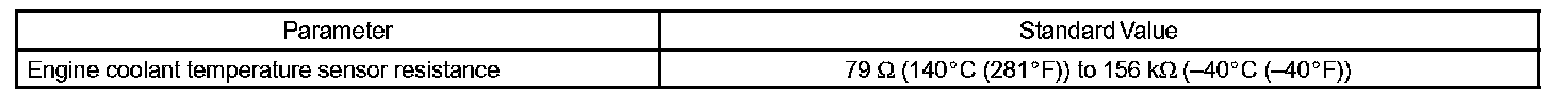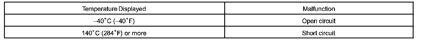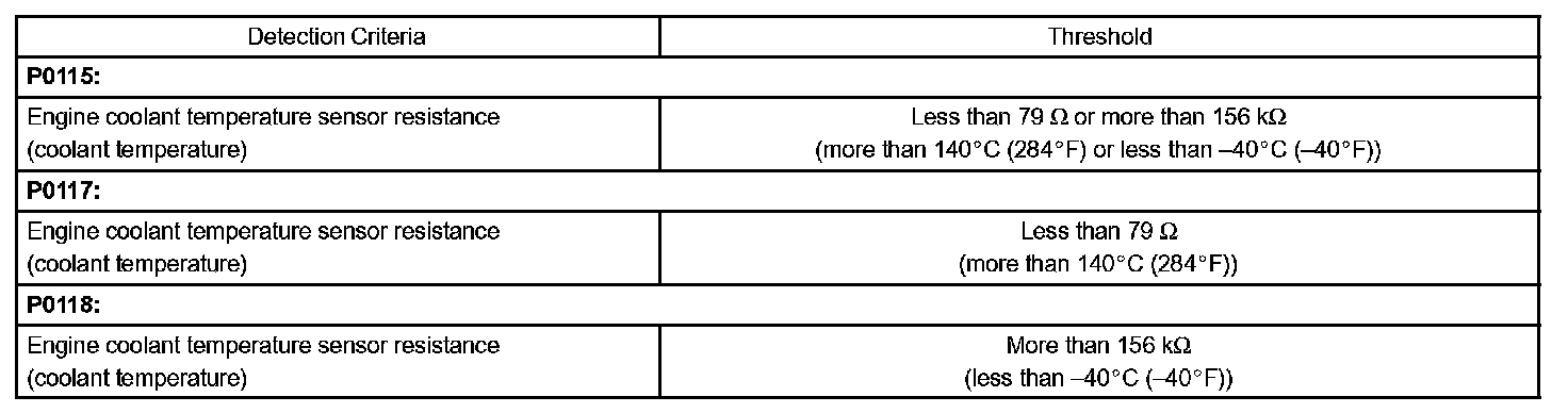 When the ECM calculates that the ECT is -40 °C (-40 °F), or more than 140 °C (284 °F), and if either the condition continues 0.5 sec or more, the ECM will set a DTC.
