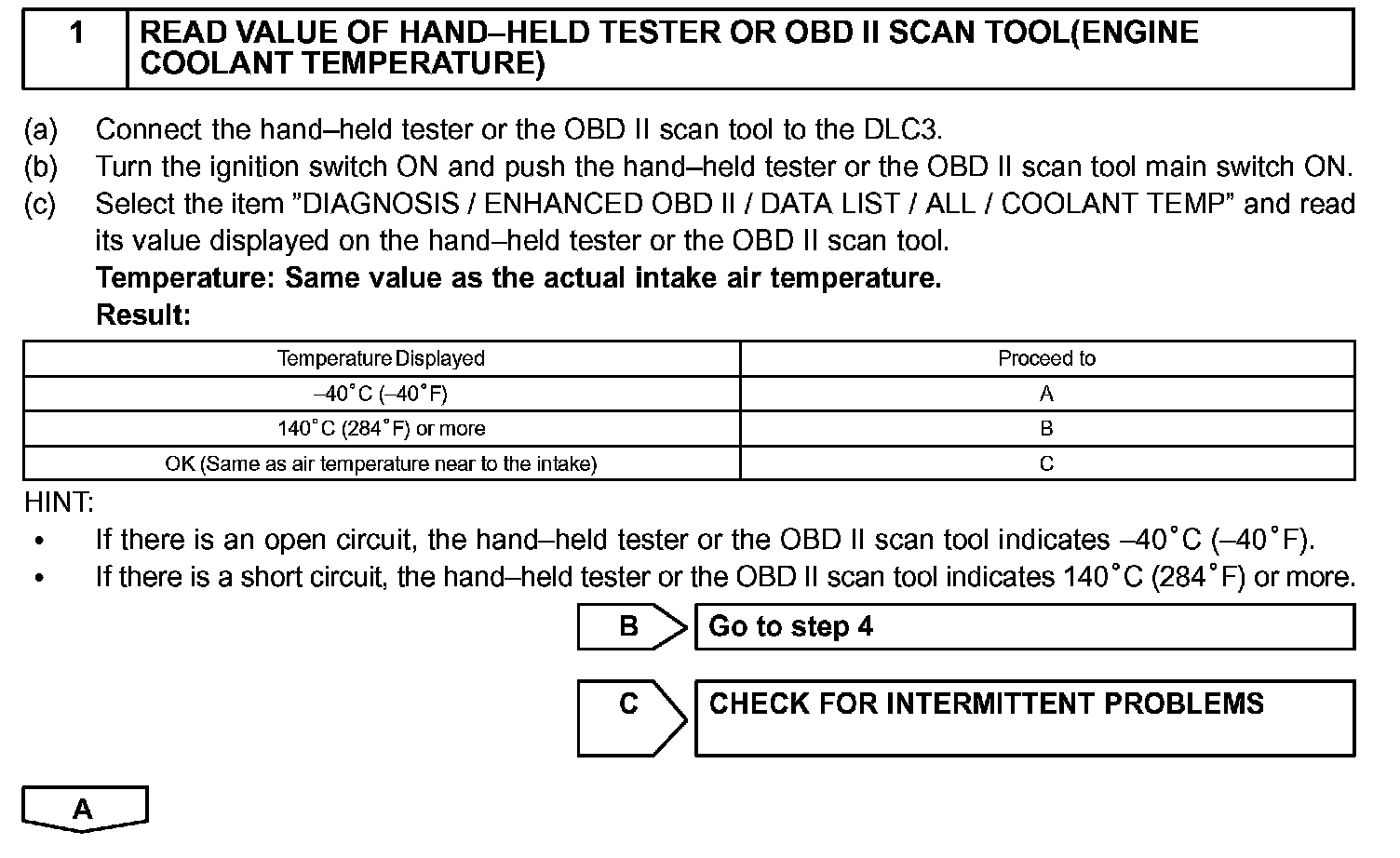 HINT: After confirming DTC P0115, P0117 or P0118, confirm the engine coolant temperature in the "DIAGNOSIS/ ENHANCED OBD II/DATA LIST/ALL" using the hand-held tester or the OBD II scan tool.
