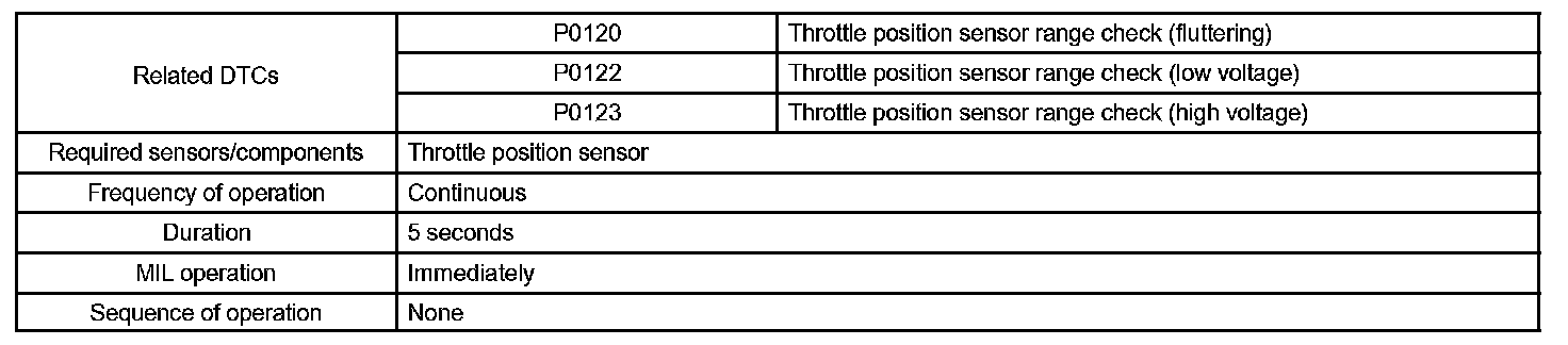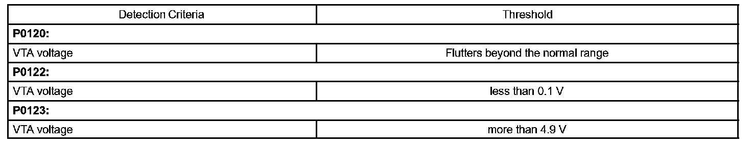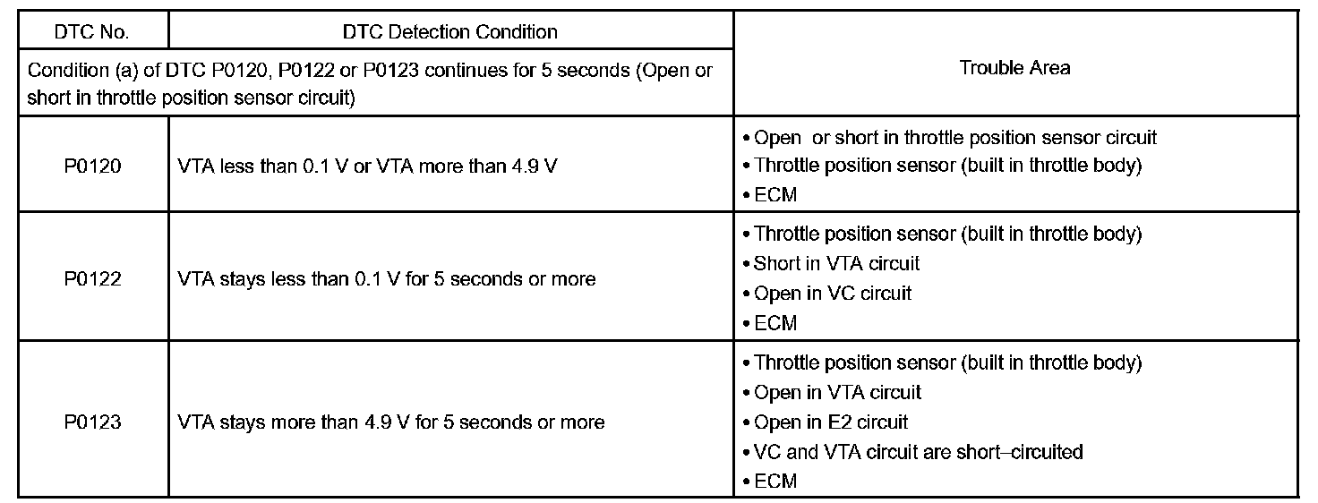 If the ECM detects that the output voltage of the throttle position sensor is out of the normal range, the ECM interprets this as a malfunction in the throttle position sensor and sets a DTC.