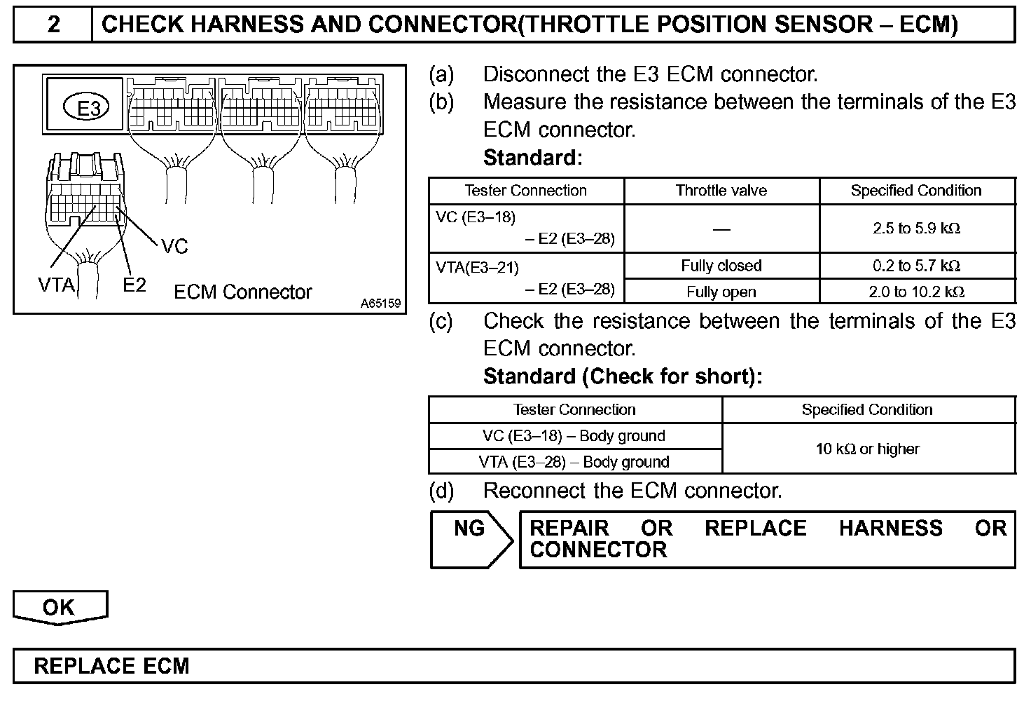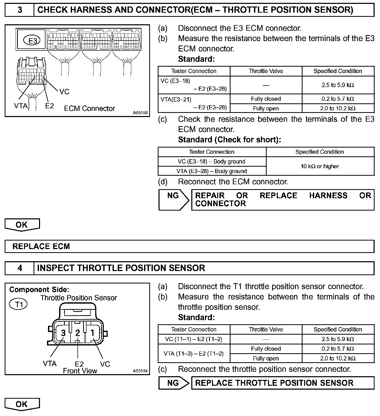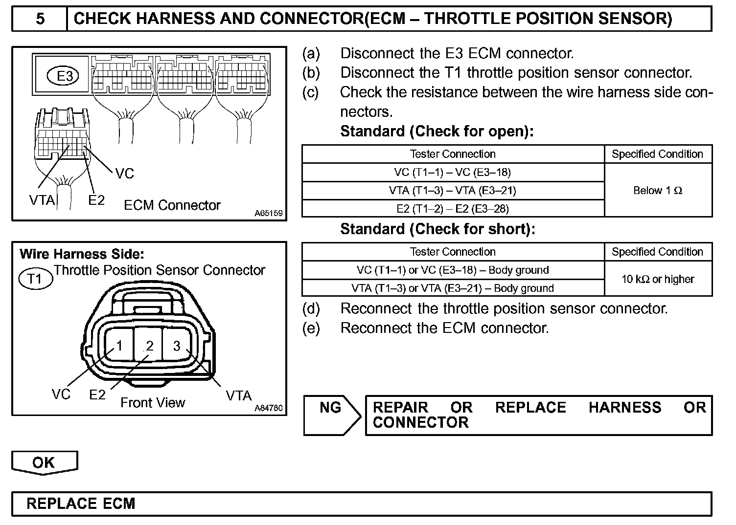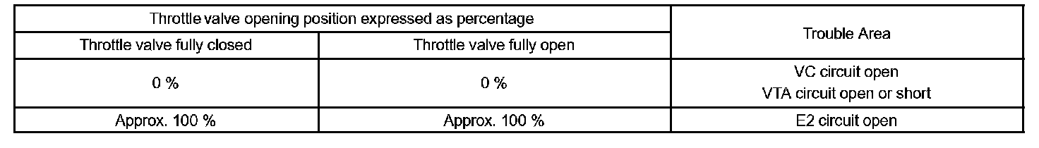 When the throttle valve is fully closed, a voltage of approximately 0.3 to 1.0 V is applied to terminal VTA of the ECM. The voltage applied to terminal VTA of the ECM increases in proportion to the opening angle of the throttle valve and becomes approximately 3.2 to 4.9 V when the throttle valve is fully opened. The ECM judges the vehicle driving conditions from these signals input from terminal VTA, uses them as one of the conditions for deciding the air-fuel ratio correction, power increase correction and fuel-cut control etc.