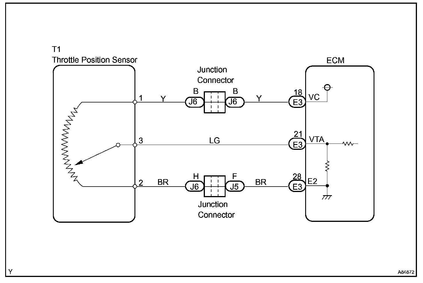 The throttle position sensor varies its resistance with the throttle valve angle. The ECM applies a regulated reference voltage to the throttle position sensor "+: VC" terminal and calculates the angle of the throttle valve based on the voltage present at the throttle position sensor "signal: VTA" terminal.