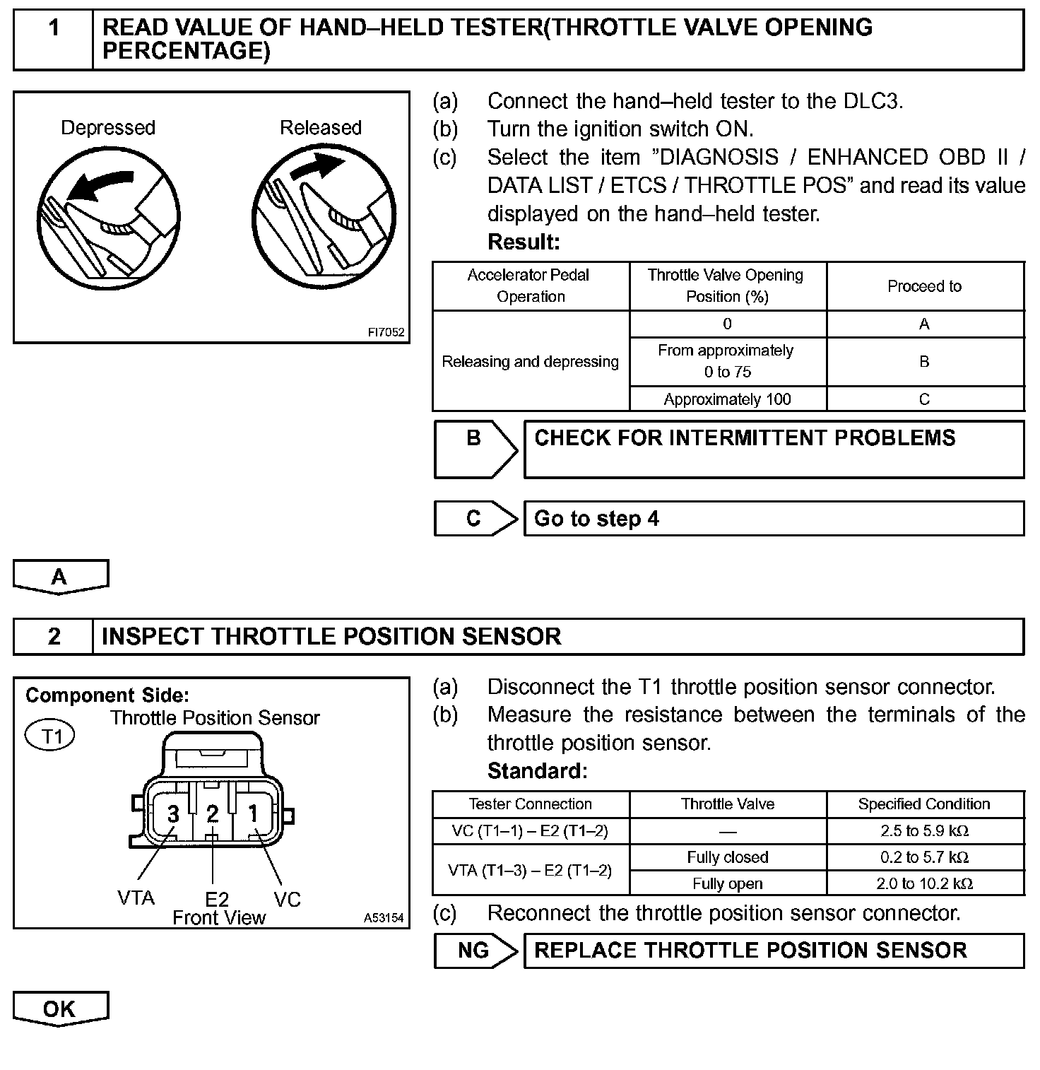 HINT: After confirming DTCs, confirm the throttle valve opening percentage and closed throttle position switch condition using the hand-held tester or the OBD II scan tool.