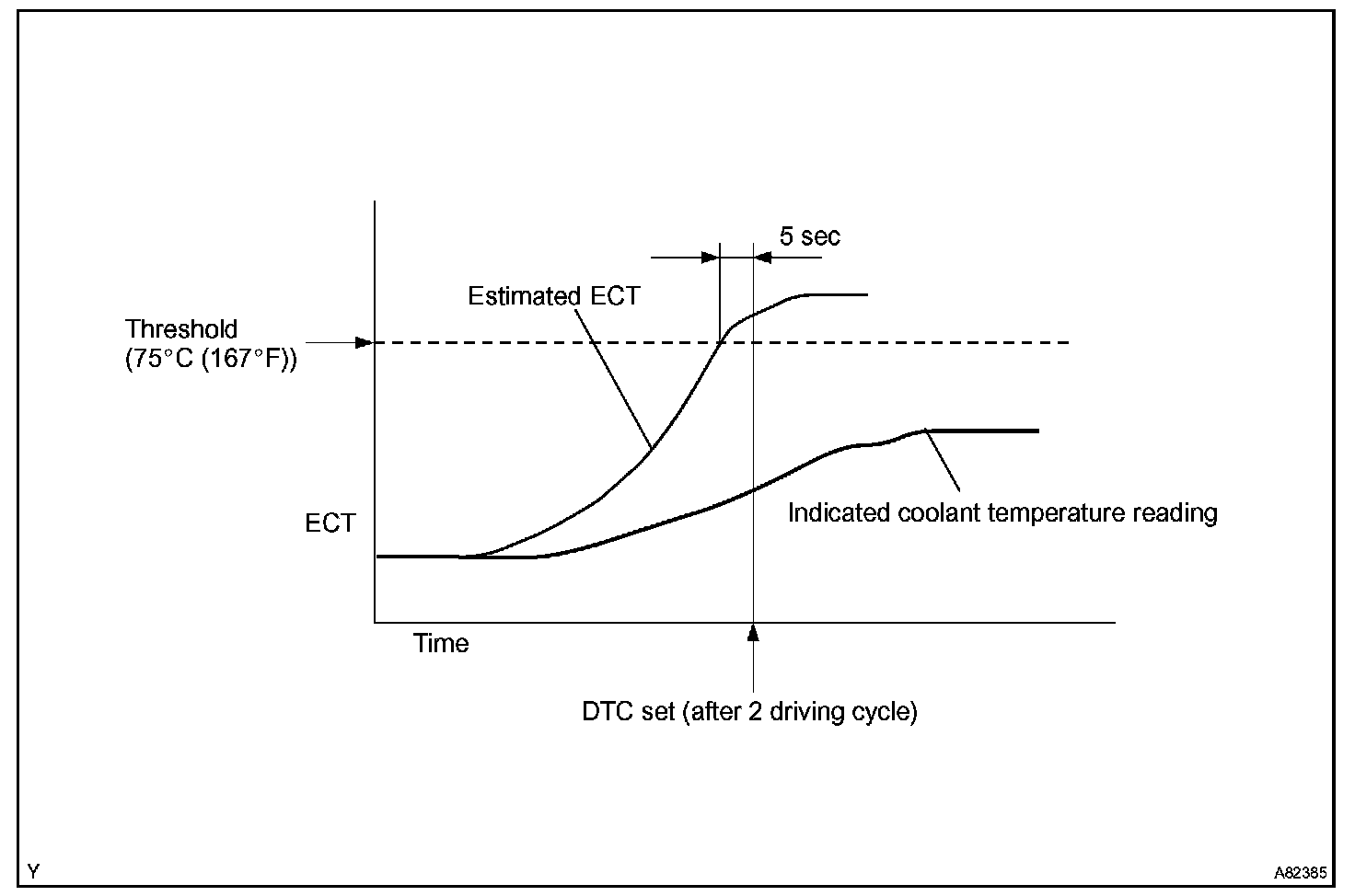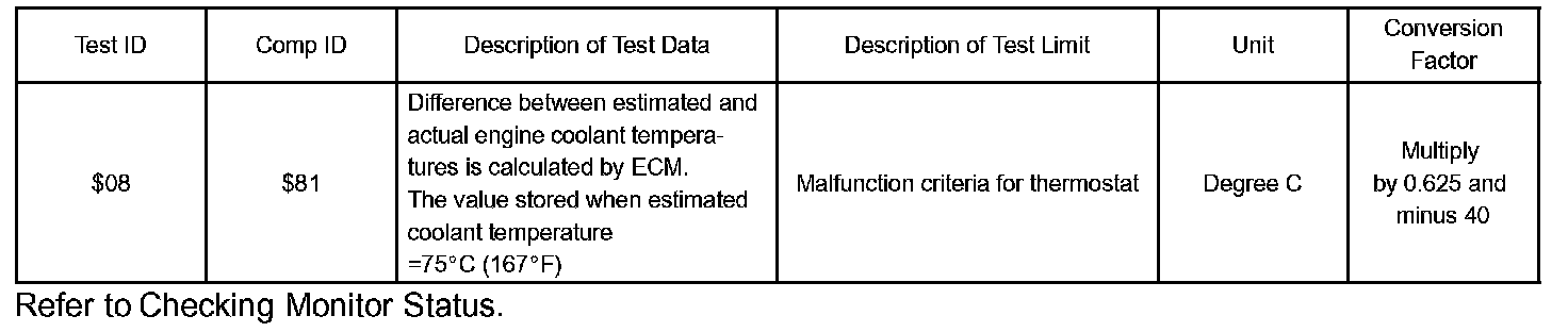 The ECM estimates the engine coolant temperature (ECT) based on starting temperature, engine loads, and engine speeds. The ECM then compares the estimated ECT with the actual ECT. When the estimated ECT reaches 75 °C (167 °F) the ECM checks the actual ECT. If the actual ECT is less than 75 °C (167 °F), the ECM will interpret this as a fault in the thermostat or engine cooling system and set a DTC.