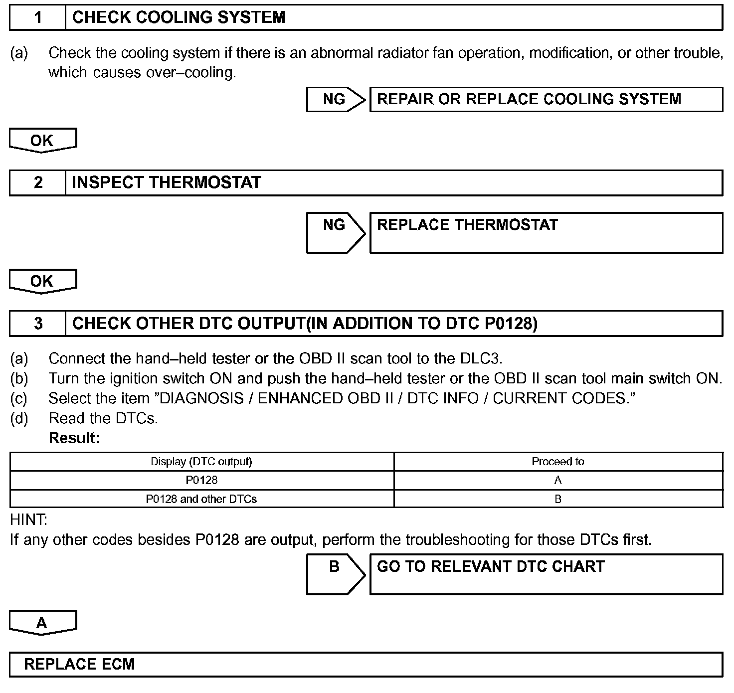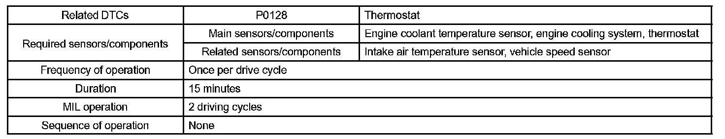 DTC P0128 COOLANT THERMOSTAT (COOLANT TEMPERATURE BELOW THERMOSTAT REGULATING TEMPERATURE)HINT: This is the purpose of the "thermostat" malfunction detection.