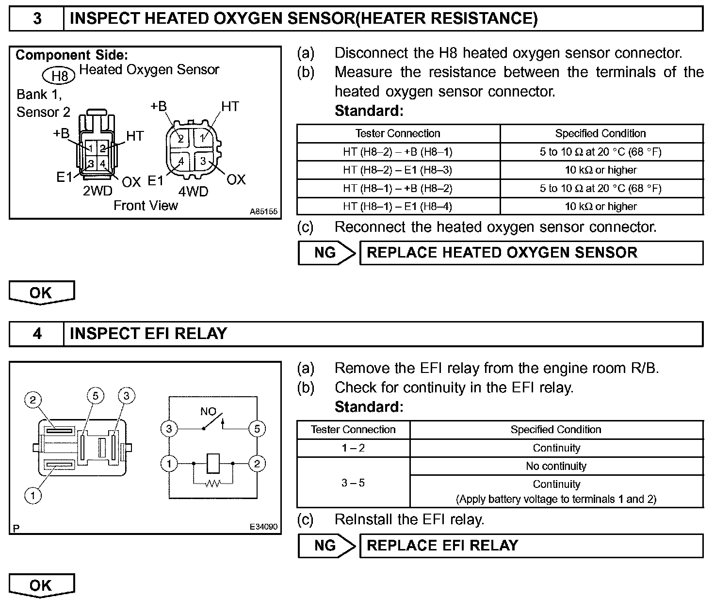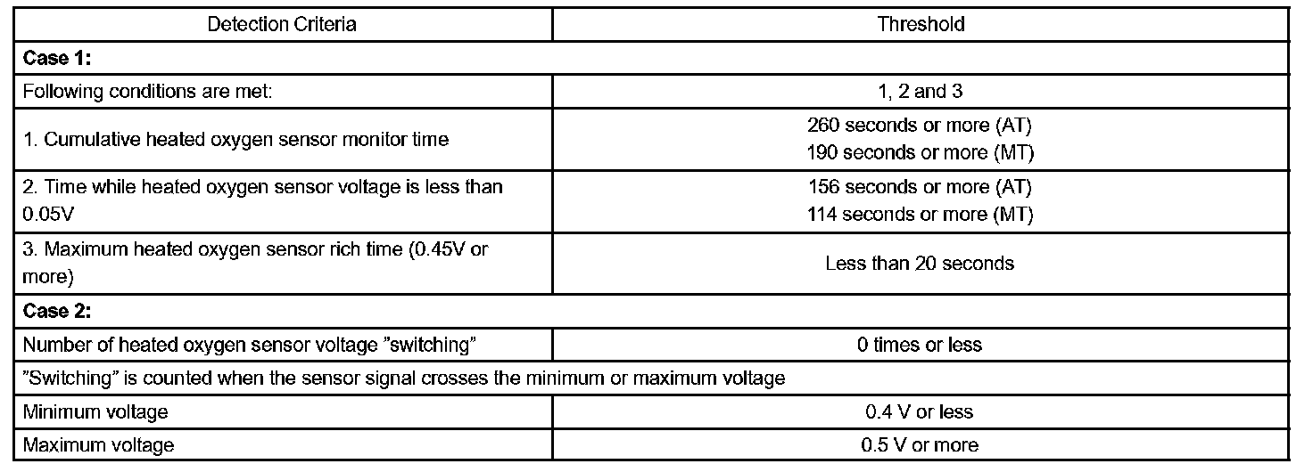 If the rear heated oxygen sensor output dose not change between RICH and LEAN during "Stop and GO" driving, the ECM interprets this as a malfunction in the rear heated oxygen sensor and sets a DTC. Also, if the sensor output remains at less than 0.05 V for more than 156 seconds when the ECM monitored the heated oxygen sensor for 260 seconds while the air-fuel feedback is being performed (the detecting condition differs depending on the type of vehicles), the ECM will interpret this as a fault. In either case, the ECM will turn on the MIL and set a DTC.
