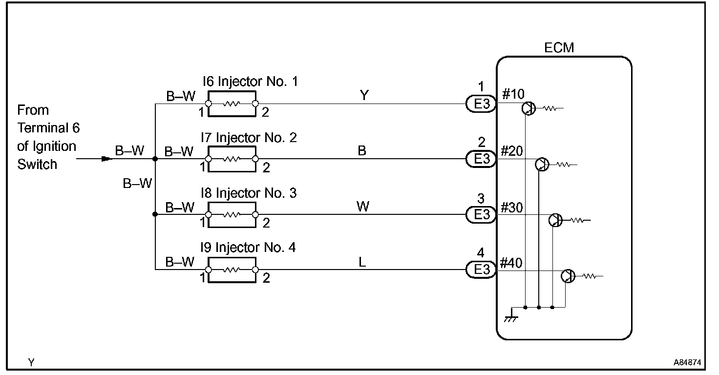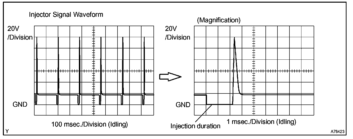 With the engine idling, check the waveform between terminals #10 to #40 and E01 of the ECM connectors.